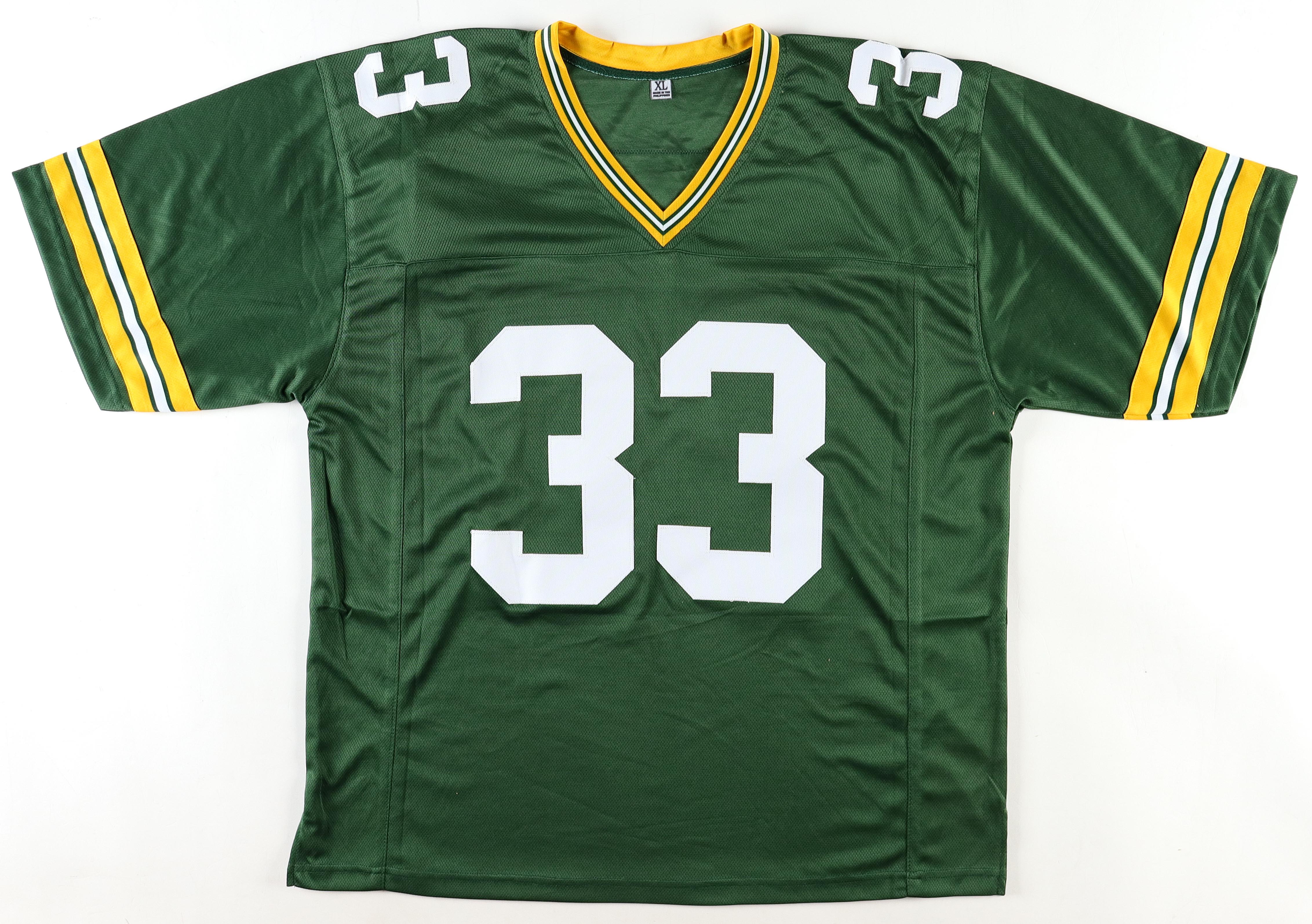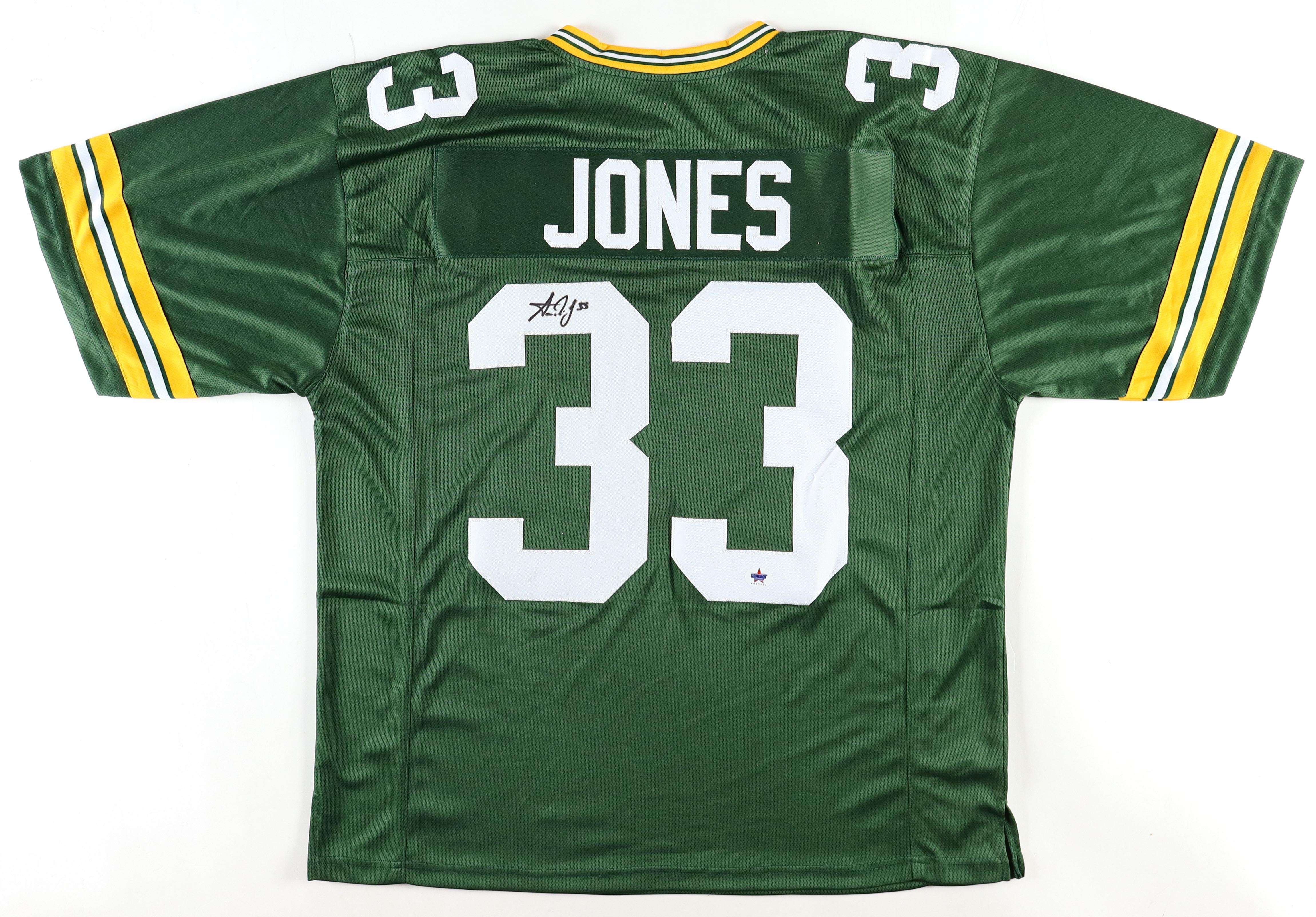 Custom jersey. Everything is sewn on, size XL. Hand-signed by Aaron Jones.