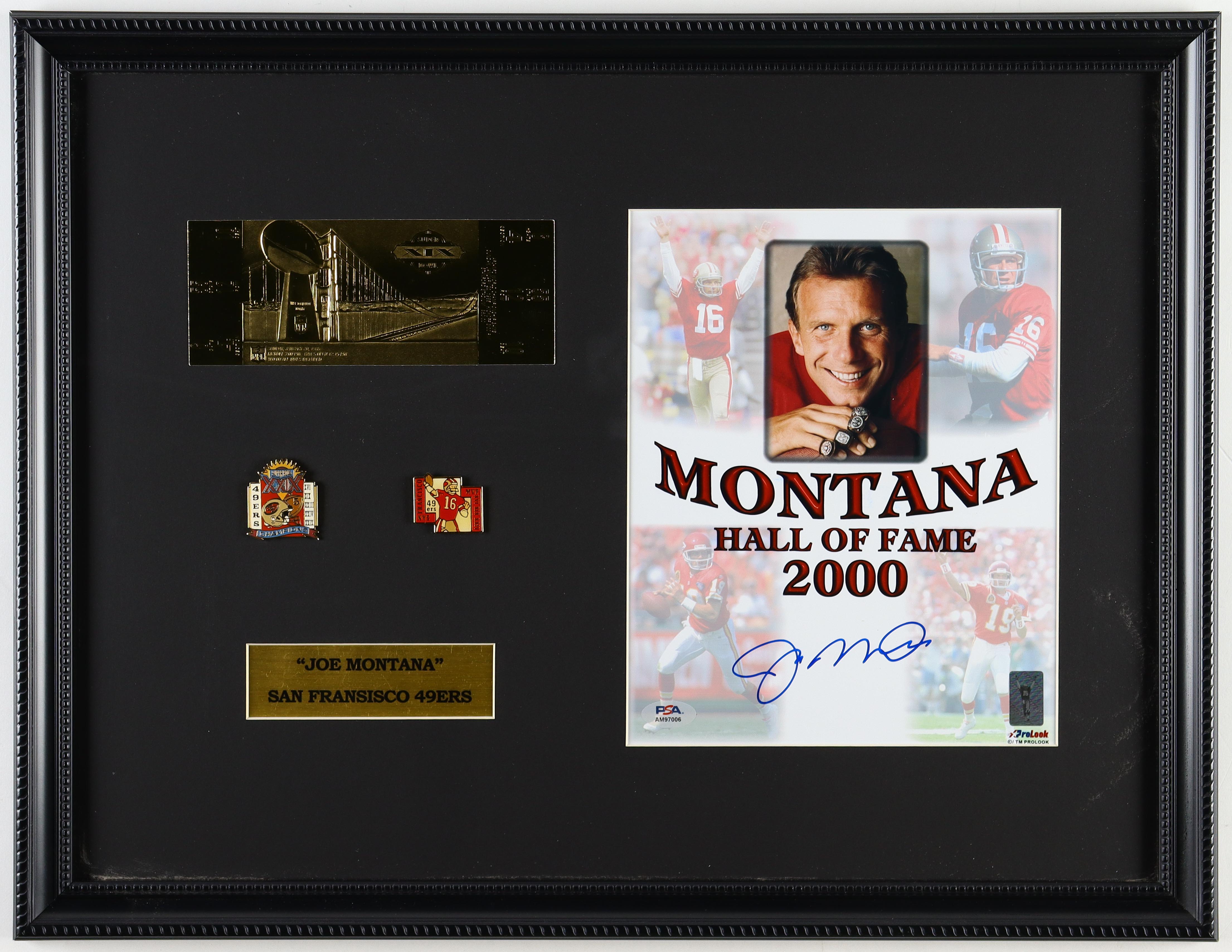 Joe Montana Signed "2000 Hall of Fame" Custom Framed Photo Display With 23kt Gold Super Bowl XIX Ticket & (2) Pins (Montana & PSA)