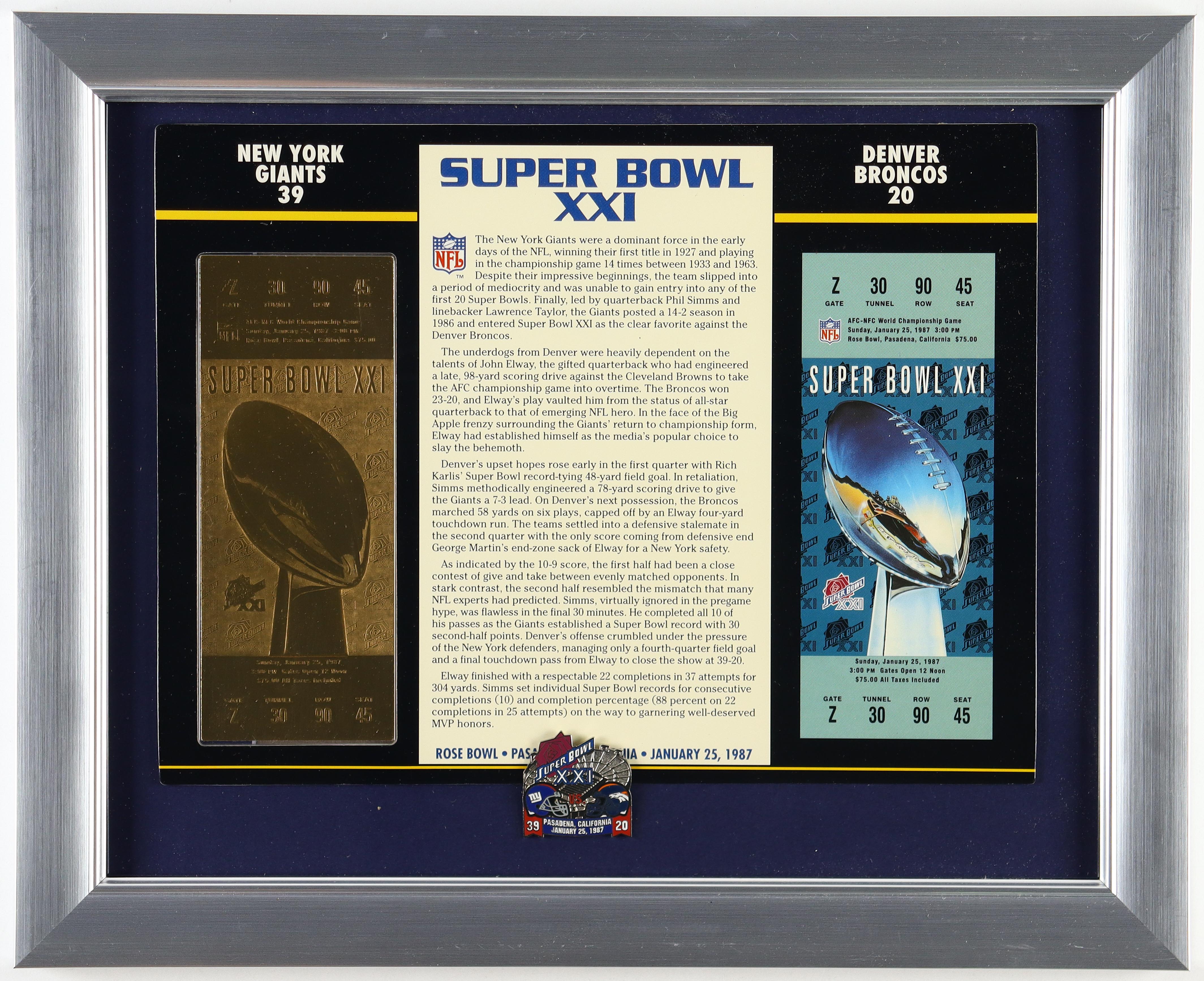 Super Bowl XXI Commemorative Score Card Custom Framed Display with 23kt Gold Ticket & Official Super Bowl XXI Pin