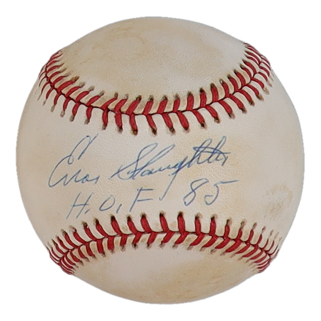 Rawlings Official National League Baseball. Hand-signed and inscribed by Enos Slaughter (D. 2002, St. Louis Cardinals, HOF). Please note, the baseball is naturally toned.