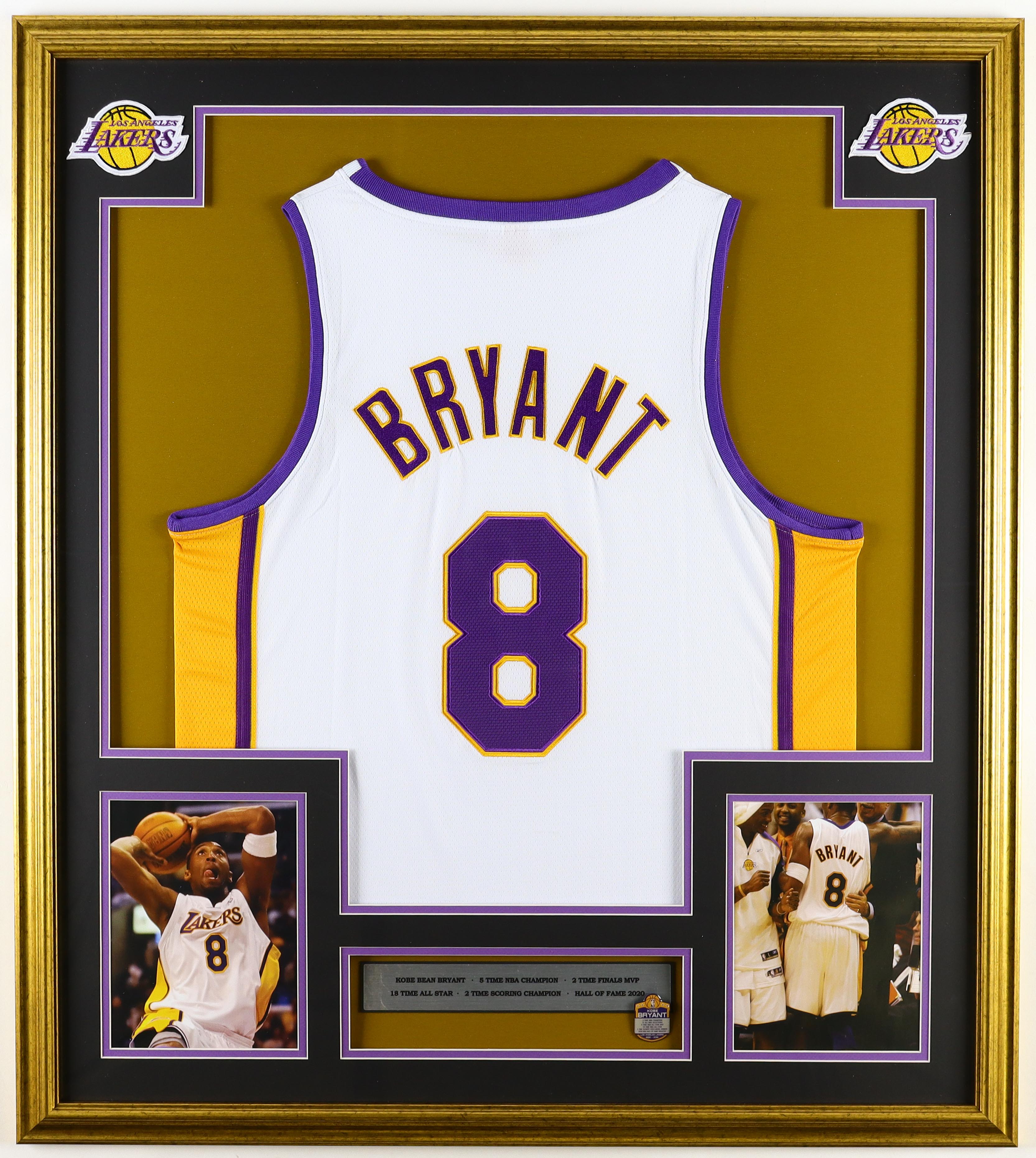 Kobe Bryant Custom Framed Jersey Display with Player Career Stat Pin (2) Cloth Logo Patches
