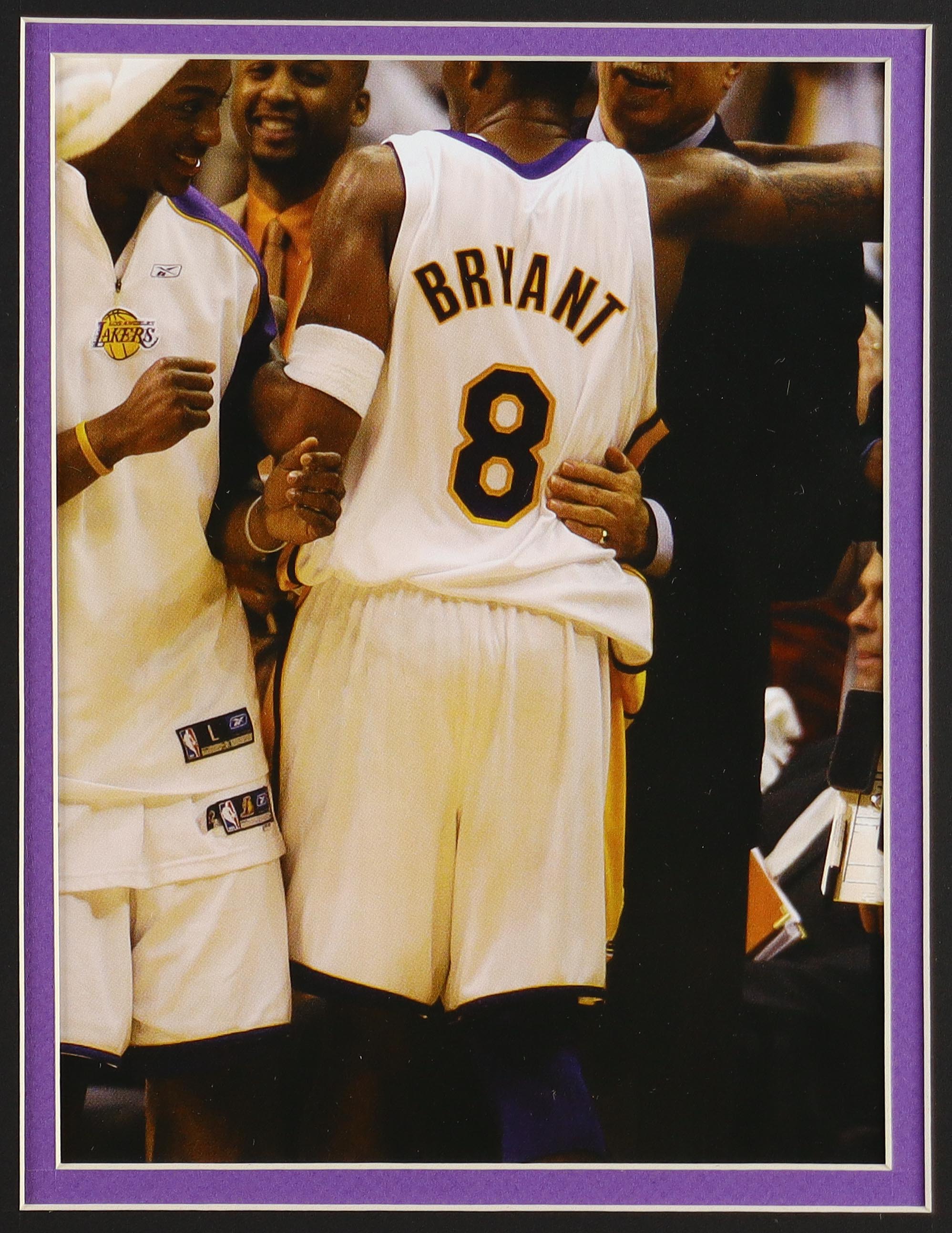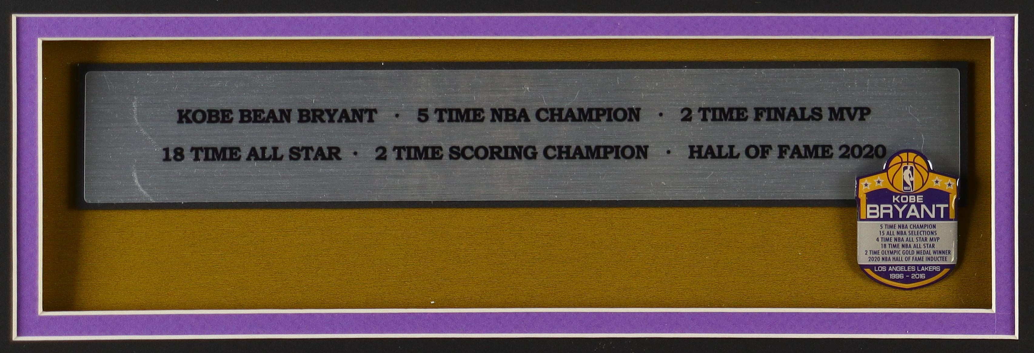 Custom frame measures approximately 33" x 37" in size. The display features an unsigned Kobe Bryant jersey, (2) photos, (2) Lakers cloth patches, and a player career stat metal pin. Please note, the display is unsigned.