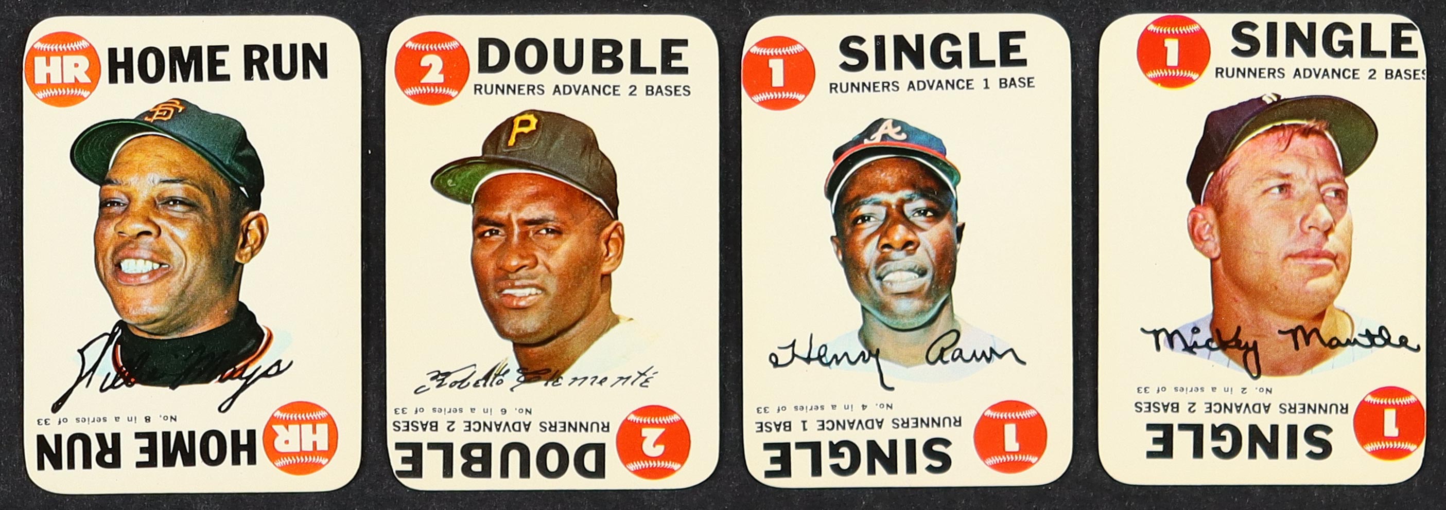 1968 Topps Game Complete Set of (33) Baseball Cards with Hank Aaron #4, Willie Mays #8, Roberto Clemente #6, Mickey Mantle #2
