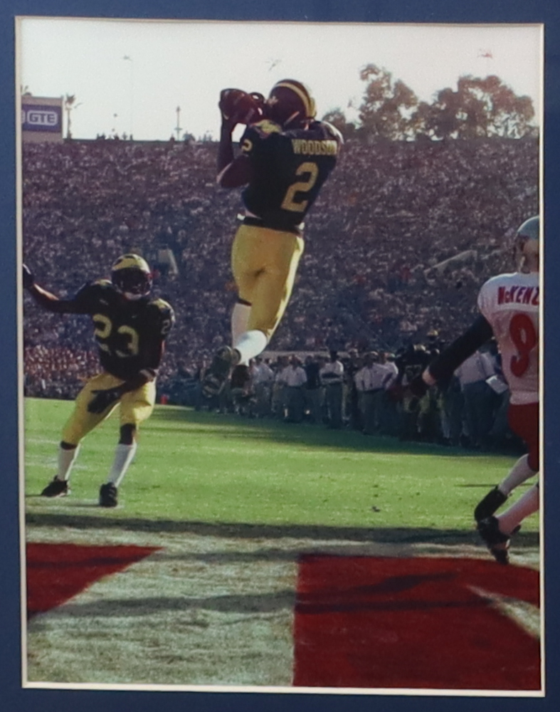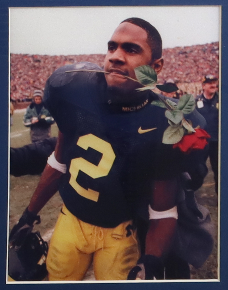 Custom frame measures 35" x 43" in size and features a jersey hand-signed by Charles Woodson (HOF). Please note that the 8" x 10" photos may be in different order.