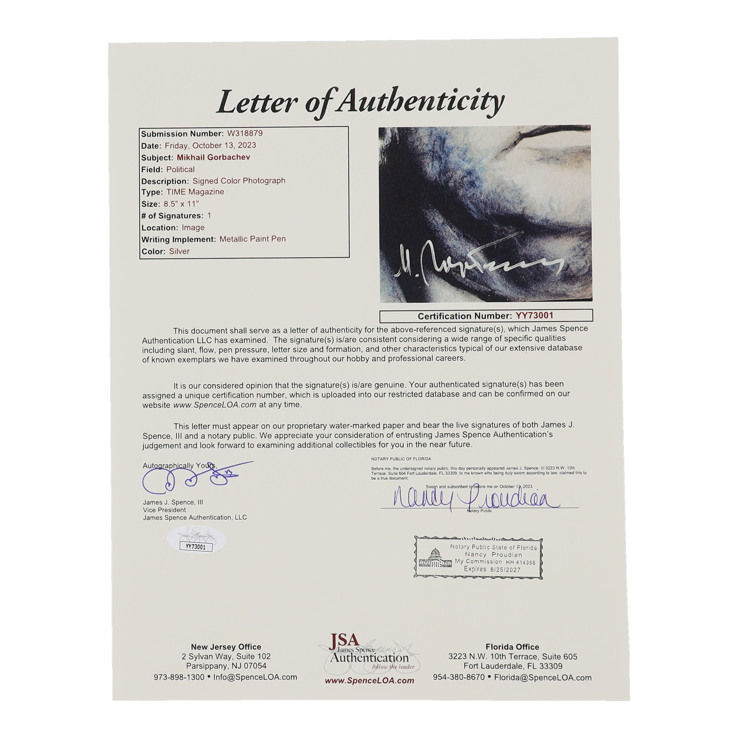 Photo measures 8" x 10" in size. Hand-signed by Mikhail Gorbachev (D. 2022).