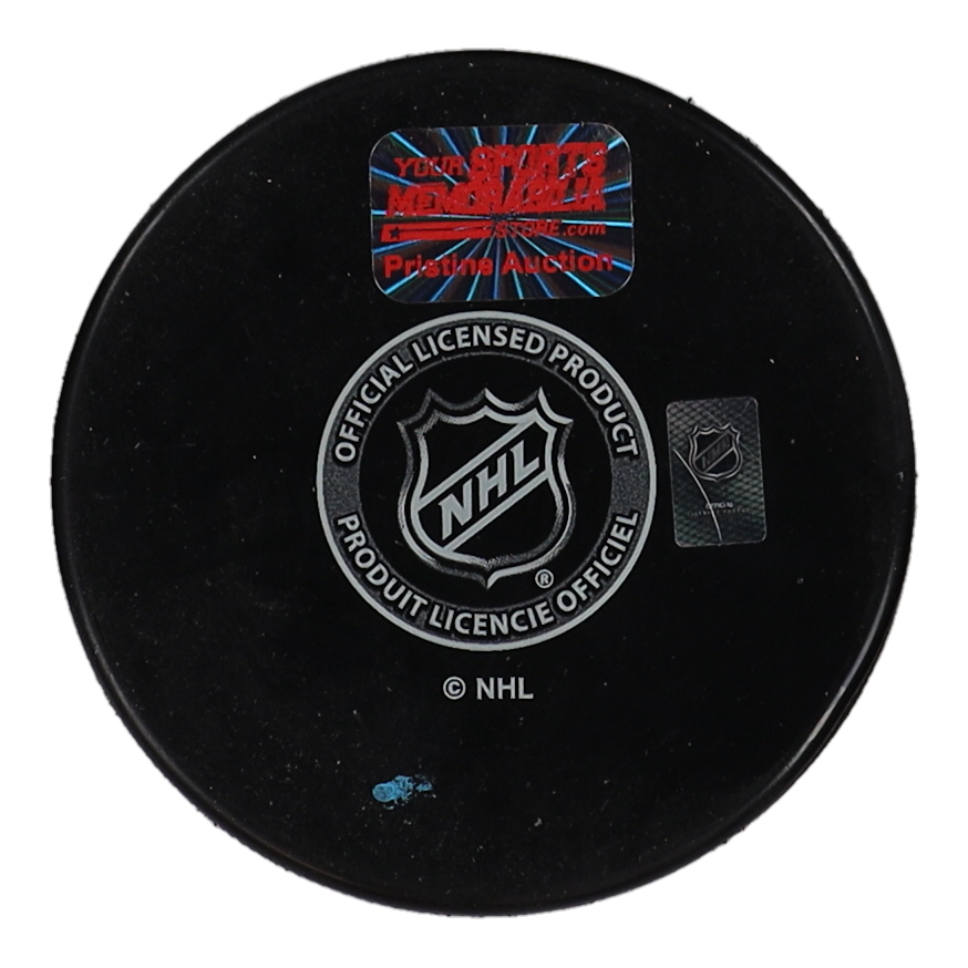 Boston Bruins logo hockey puck. Hand-signed by Brad Marchand.