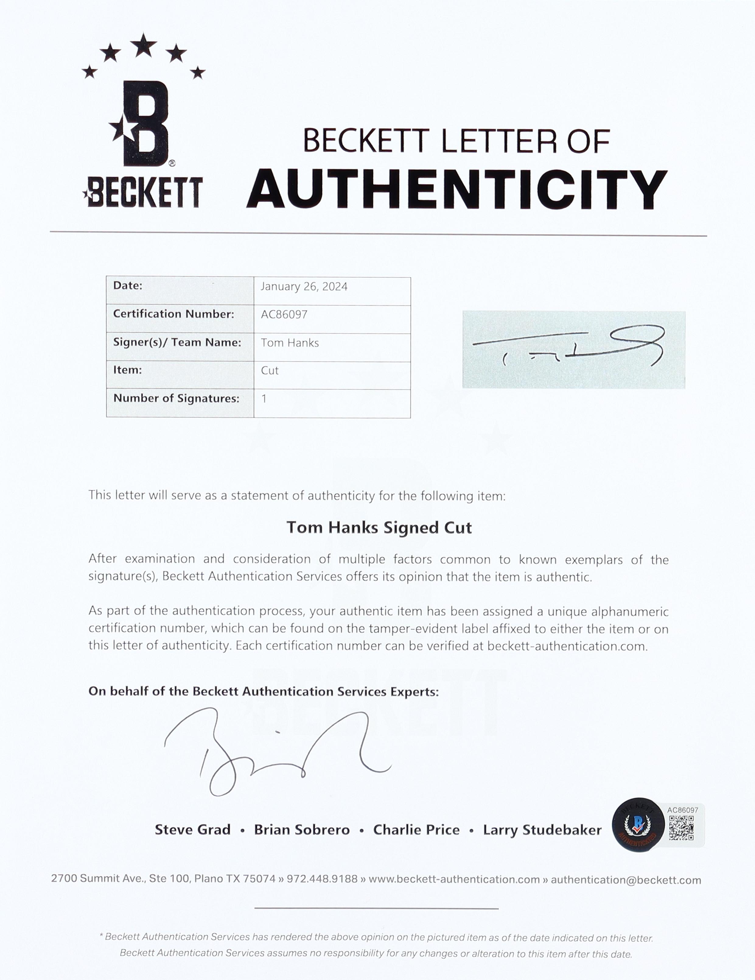 Custom framed display measures approximately 16" x 26" in size and features a cut that has been hand-signed by Tom Hanks. The display also includes a poster print for the film.