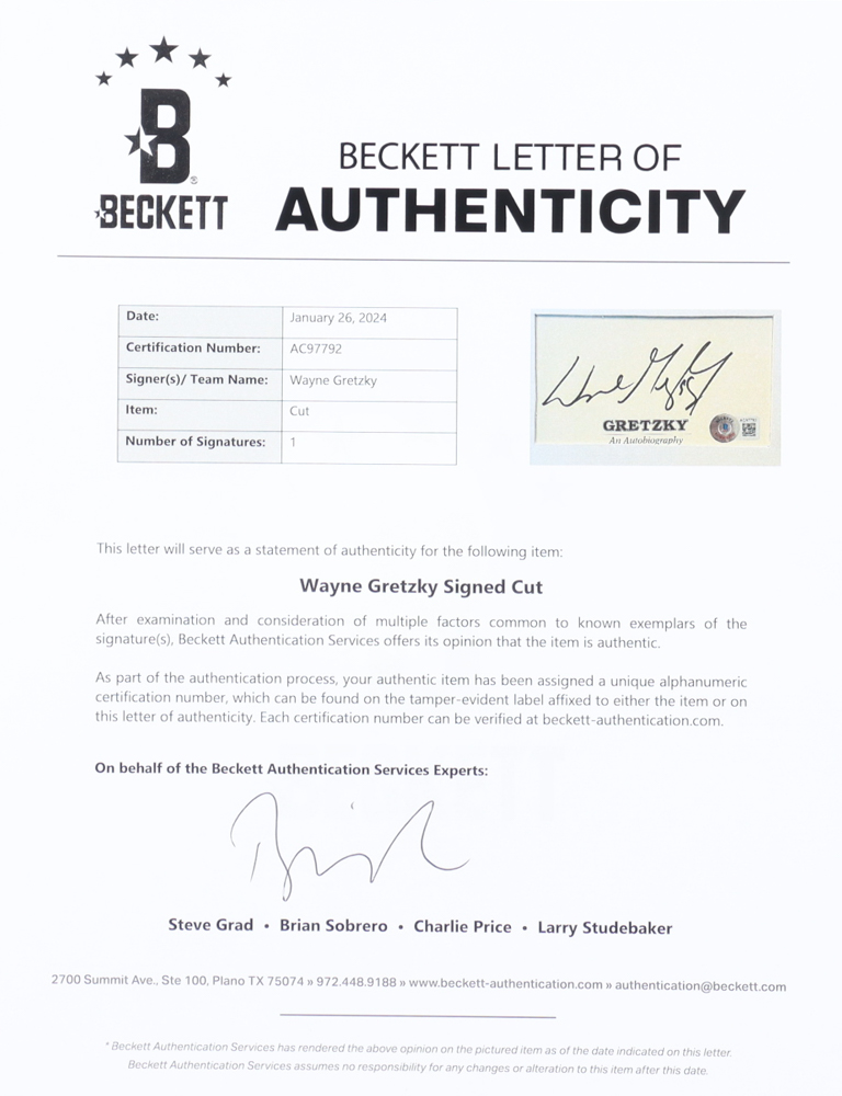 Custom matted display measures 11" x 14" in size and features a cut that has been hand-signed by Wayne Gretzky (New York Rangers, HOF). Please note, there is scuffing on the mat board.