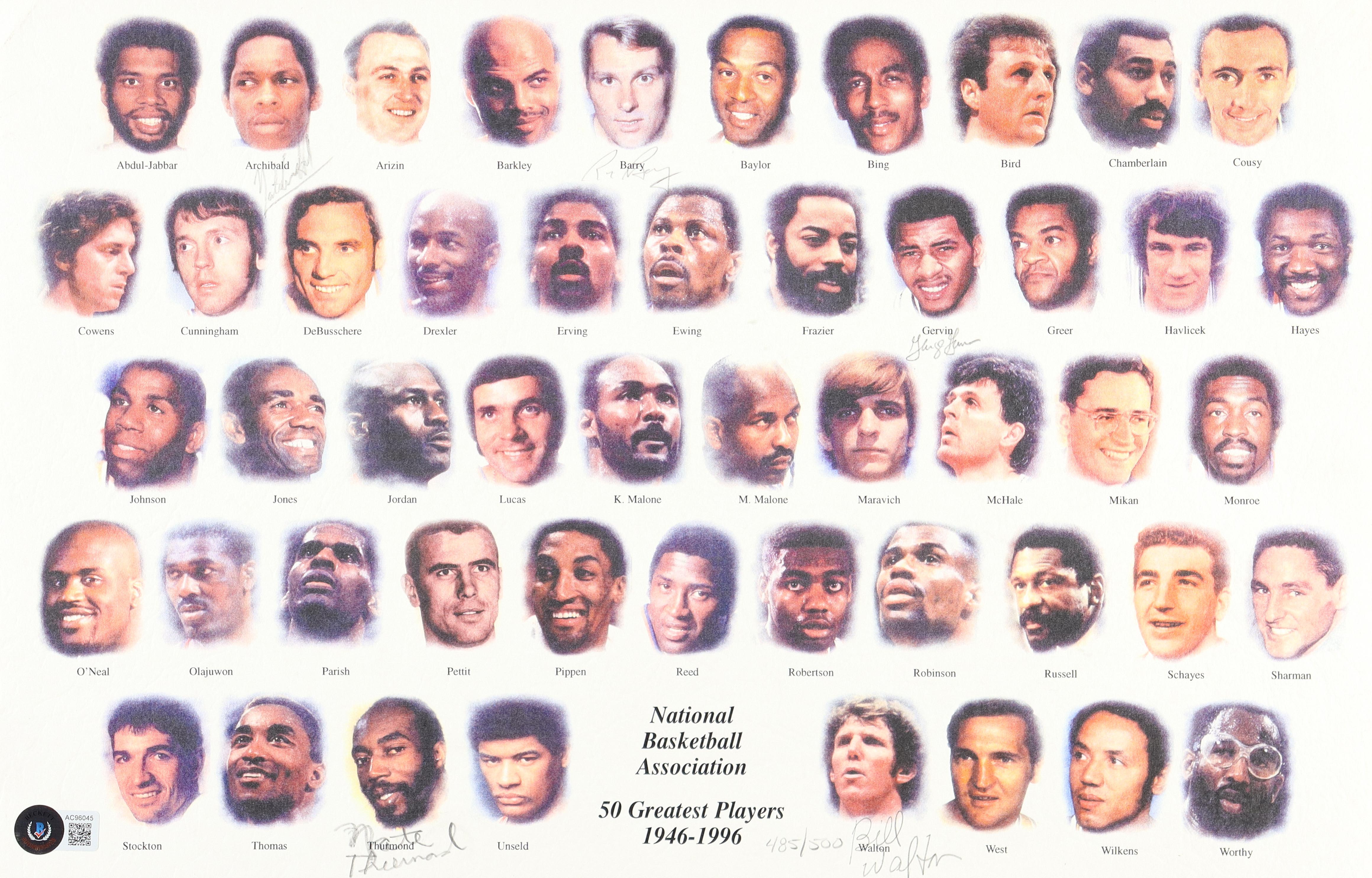 1996 NBA 50 Greatest Players 10x17 Photo Team-Signed By (5) with Rick Barry, Nate Archibald, Nate Thurmond, Bill Walton (Beckett)