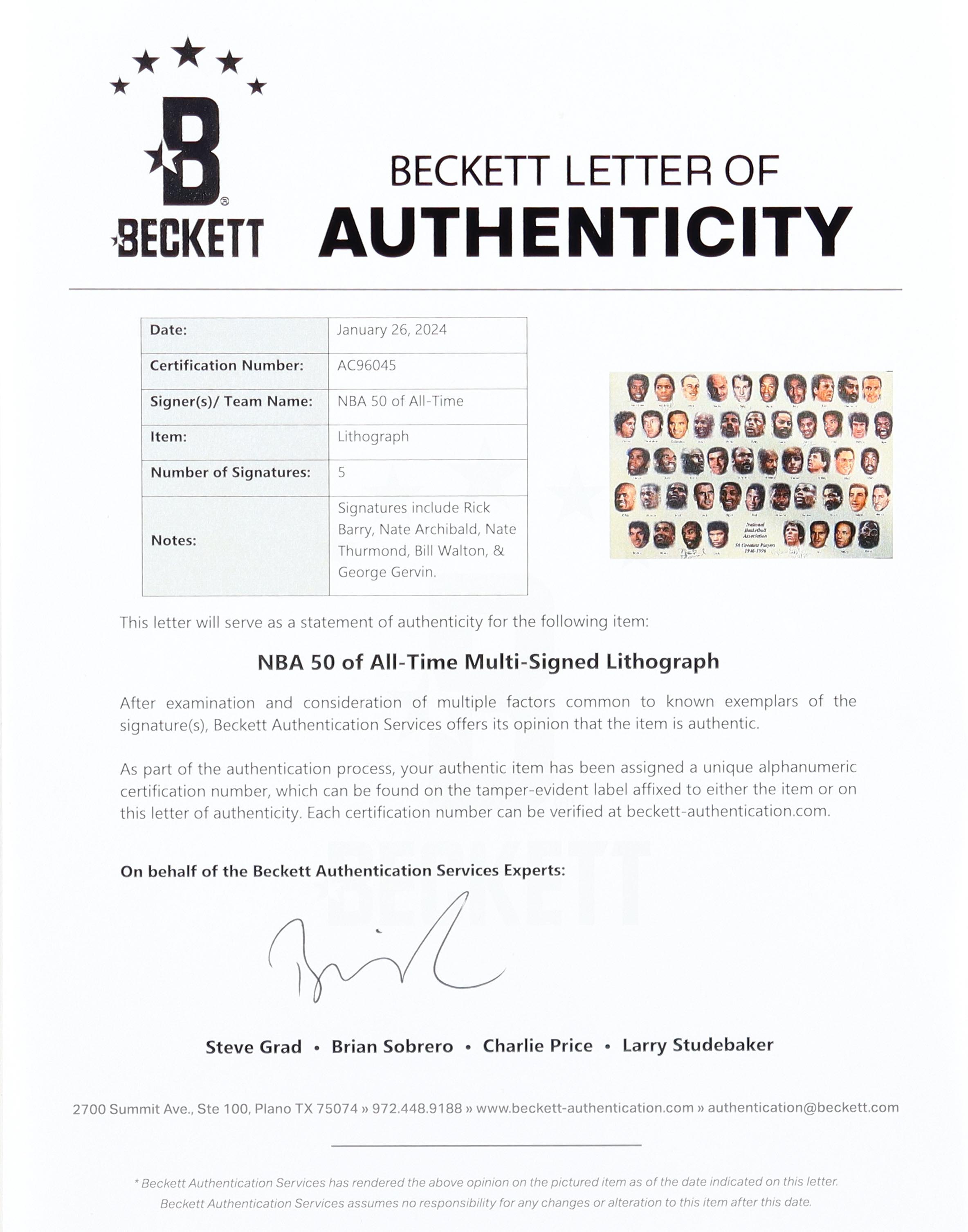Photo measures 10" x 17" in size and has been team-signed by (5) members of the NBA 50th Greatest Of All Time in 1996! Signers include Rick Barry, Nate Archibald, Nate Thurmond, Bill Walton, & George Gervin.