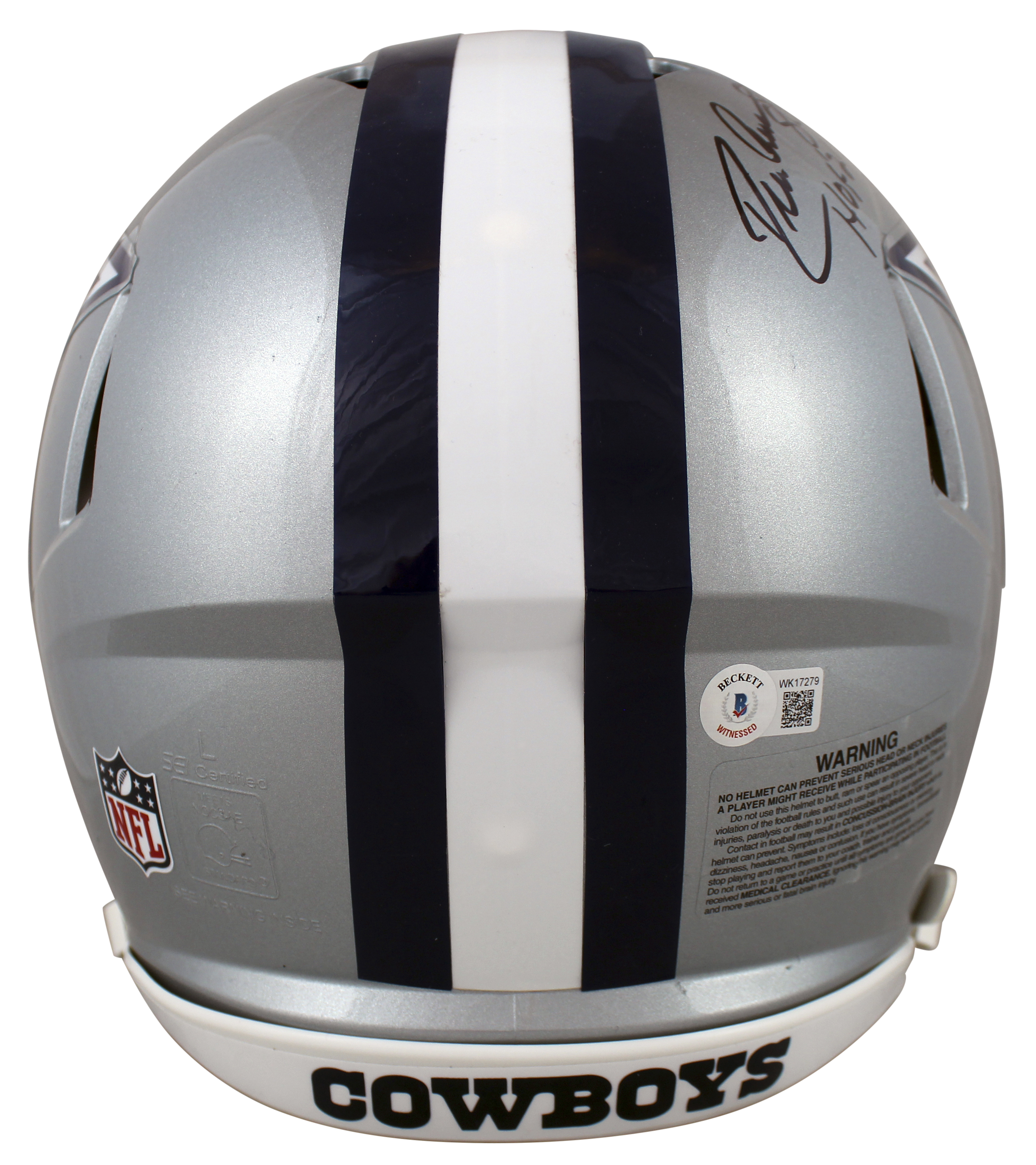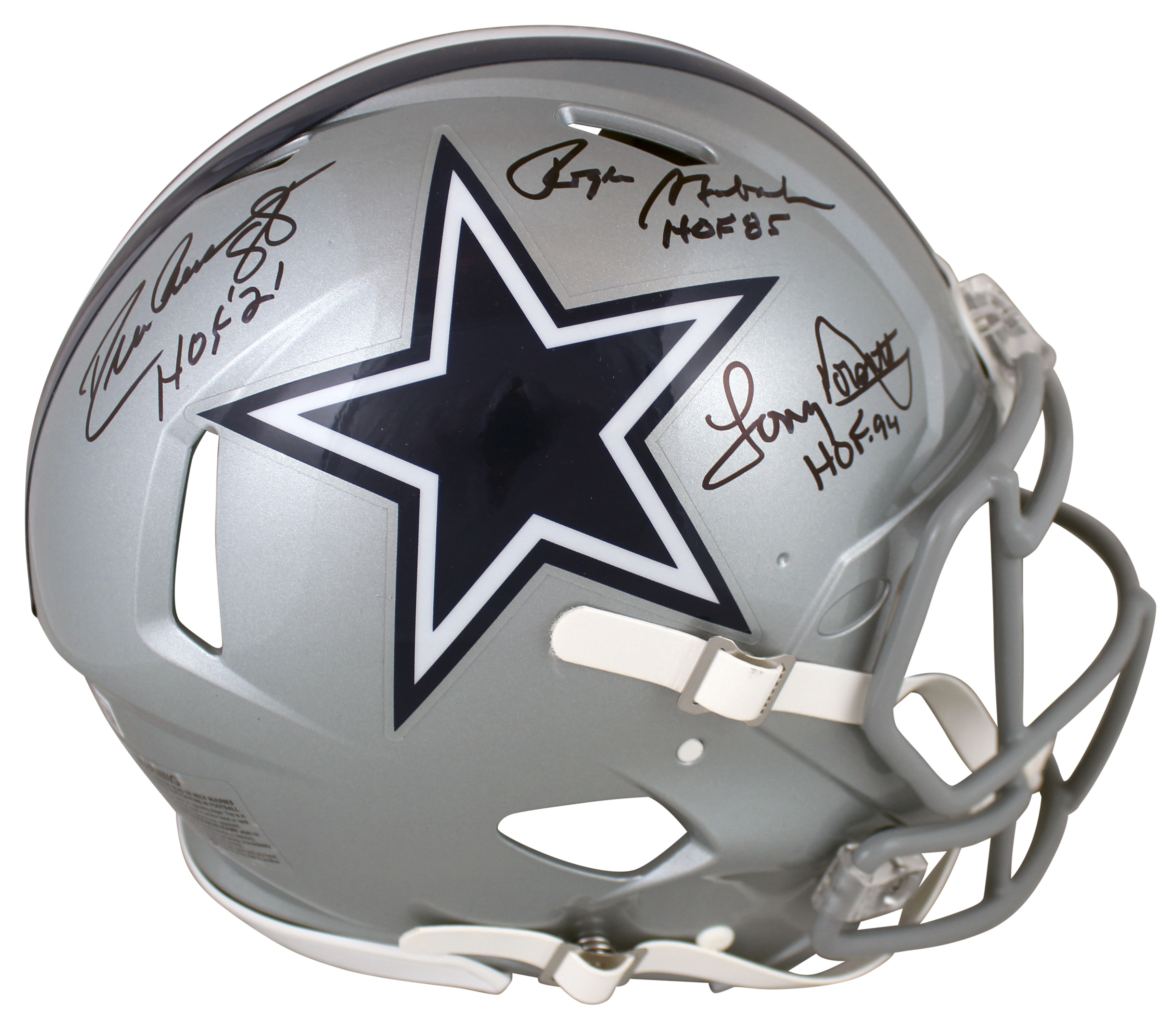 Riddell Dallas Cowboys full-size authentic on-field Speed helmet has been hand-signed and inscribed by Roger Staubach (HOF), Tony Dorsett (HOF), and Drew Pearson (HOF).