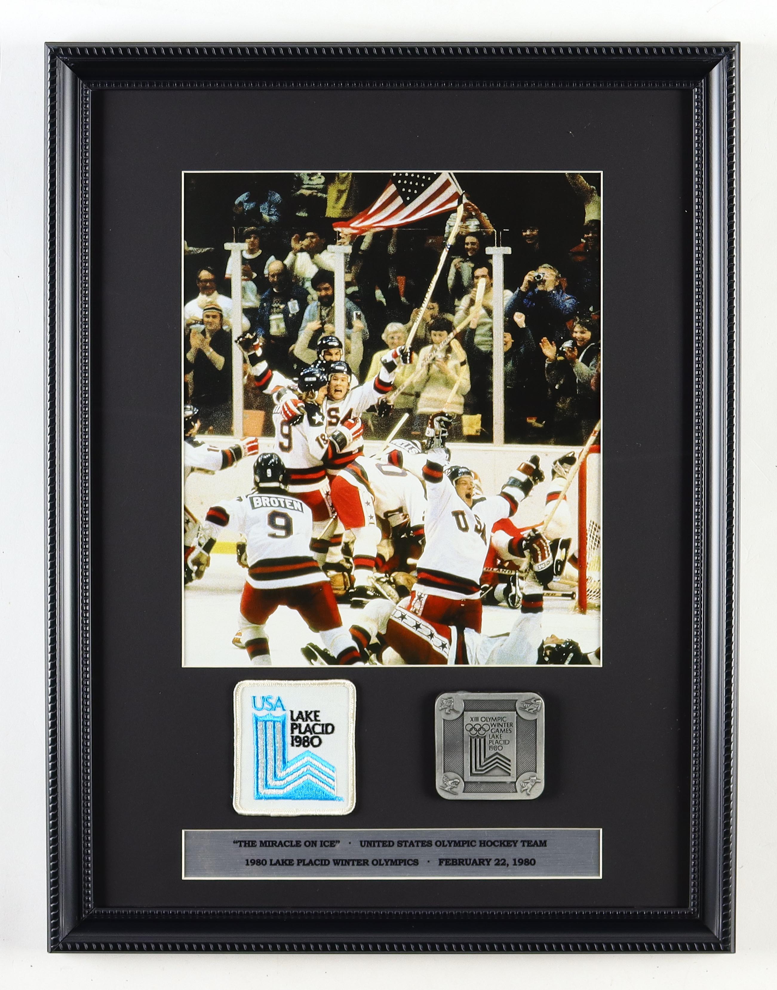 Custom frame measures 16" x 21" in size and features an unsigned photo of "The Miracle On Ice," as well as a 1980 Lake Placid Olympic Winter Games pewter emblem and matching cloth patch.