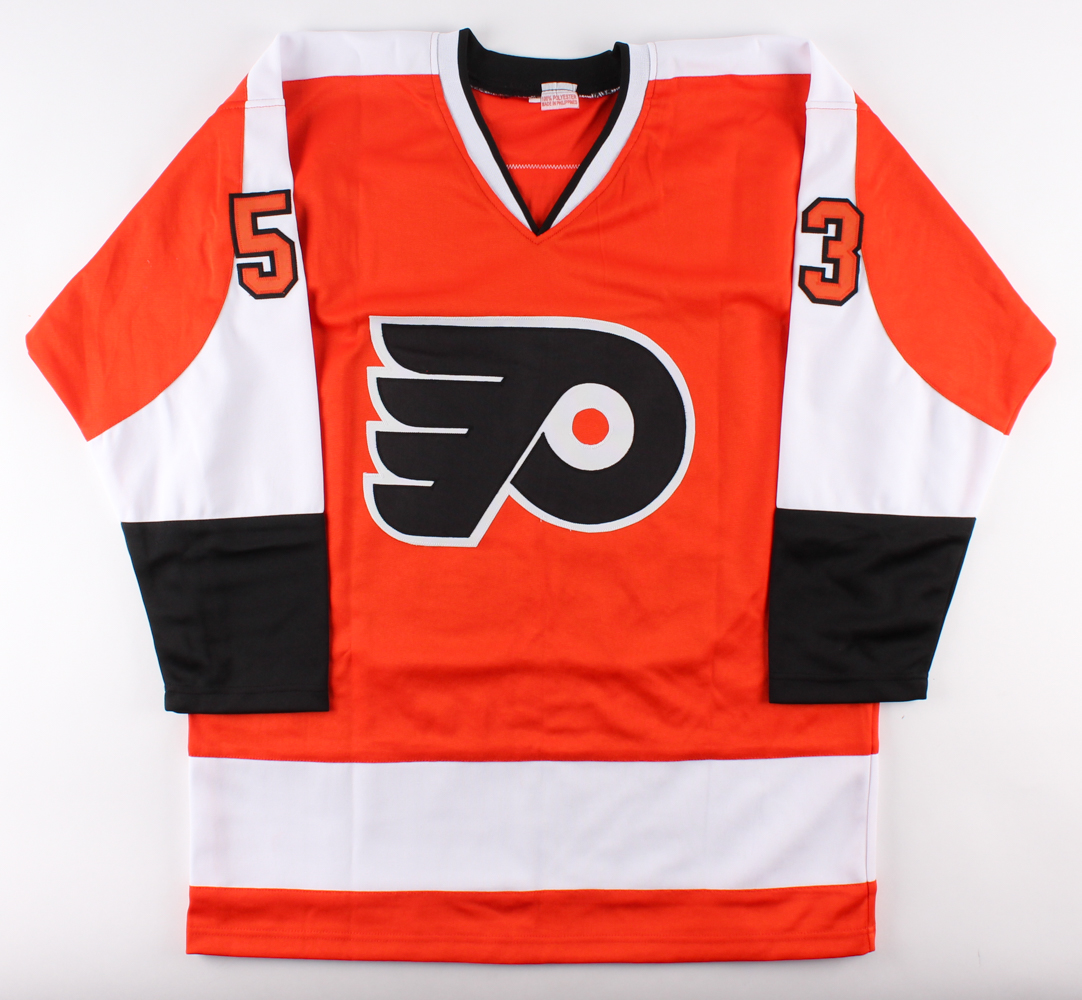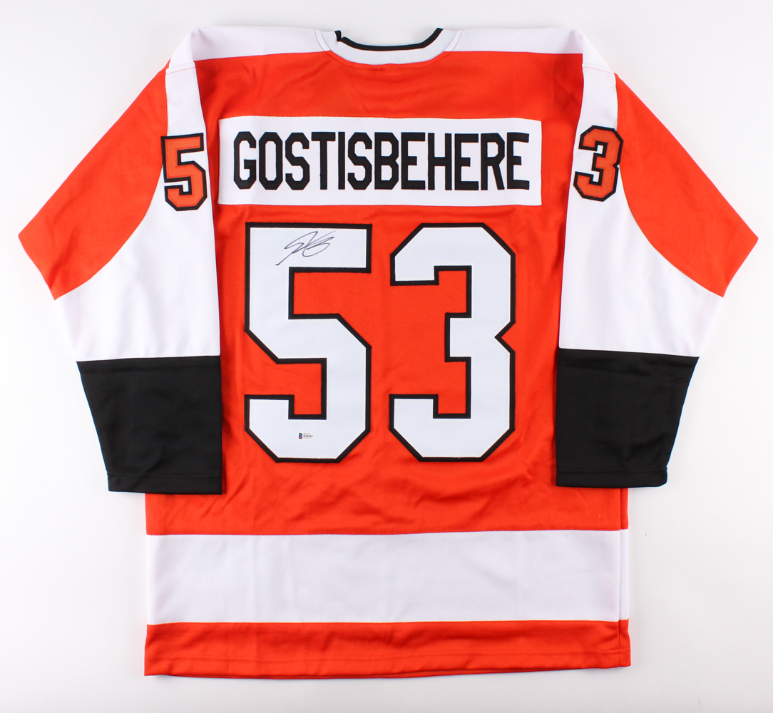 Custom on-ice style jersey. Everything is sewn on, size XL. Hand-signed in black felt-tip pen by Shayne Gostisbehere.