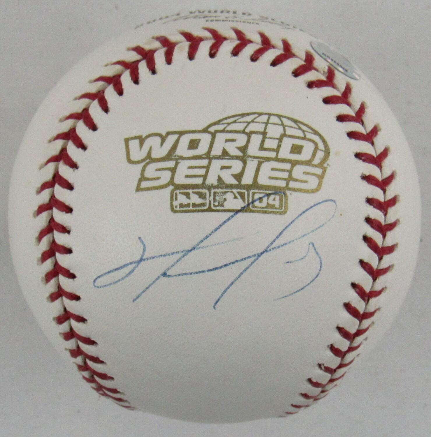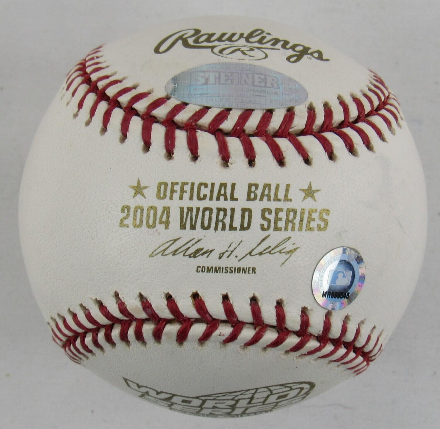Rawlings Official 2004 World Series Logo baseball has been hand-signed by David Ortiz (Boston Red Sox, HOF).