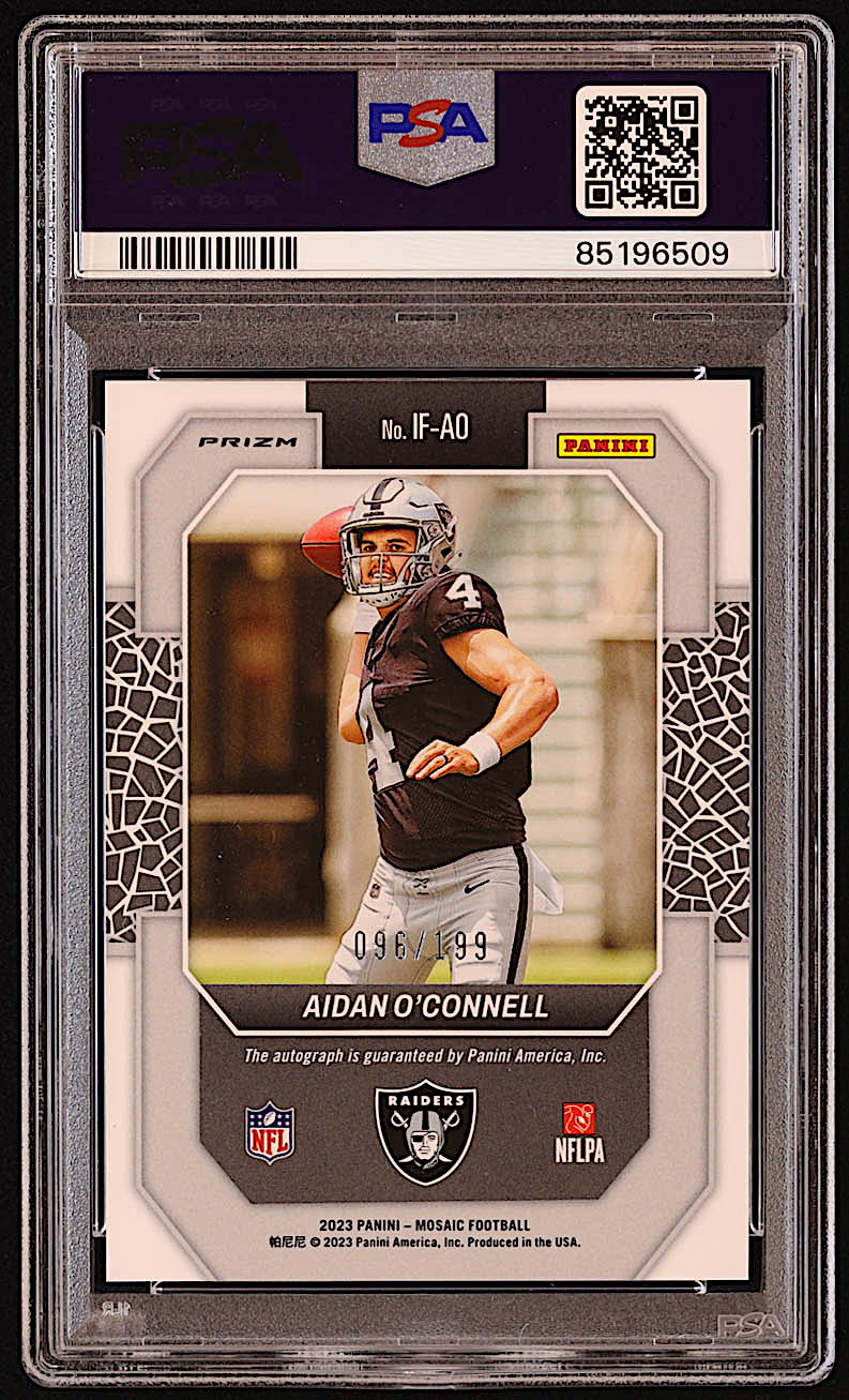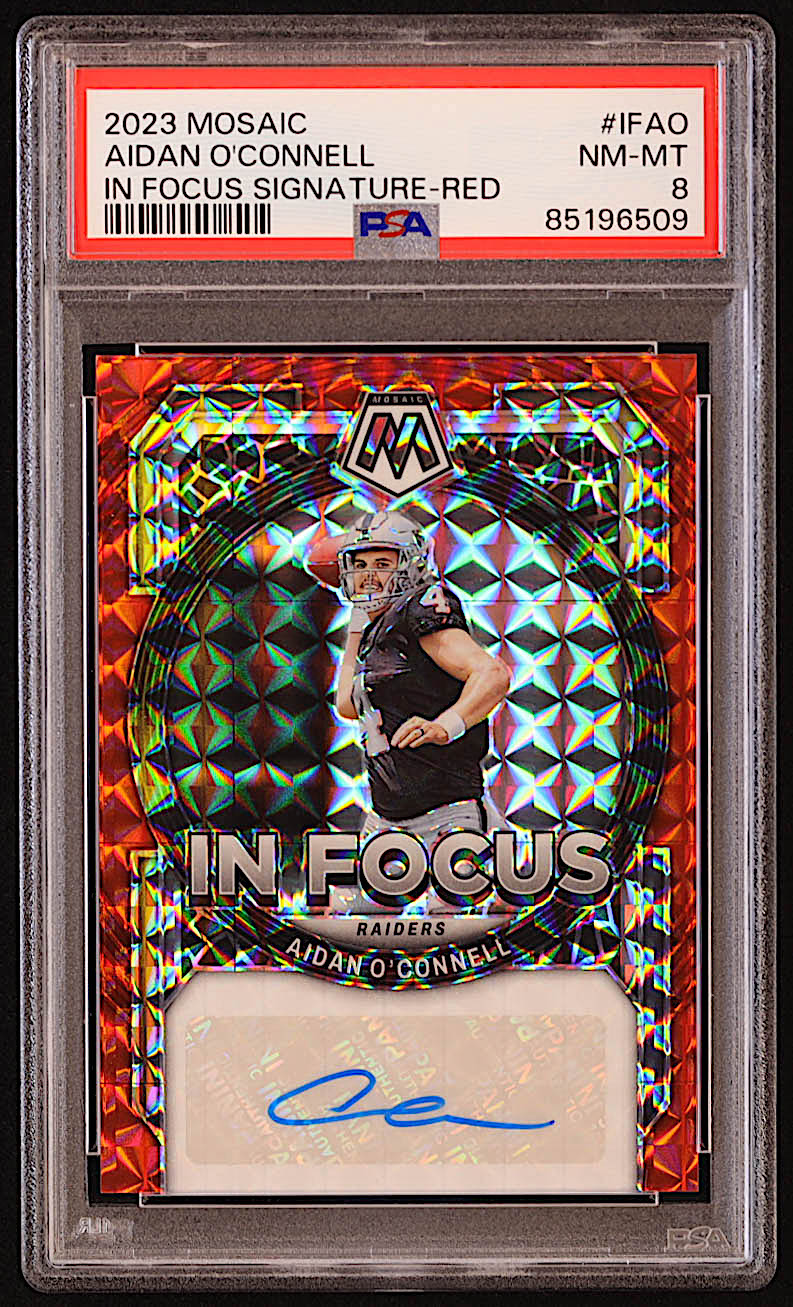 Aidan O'Connell 2023 Panini Mosaic In Focus Signatures Red #4 RC #096/199 (PSA 8)