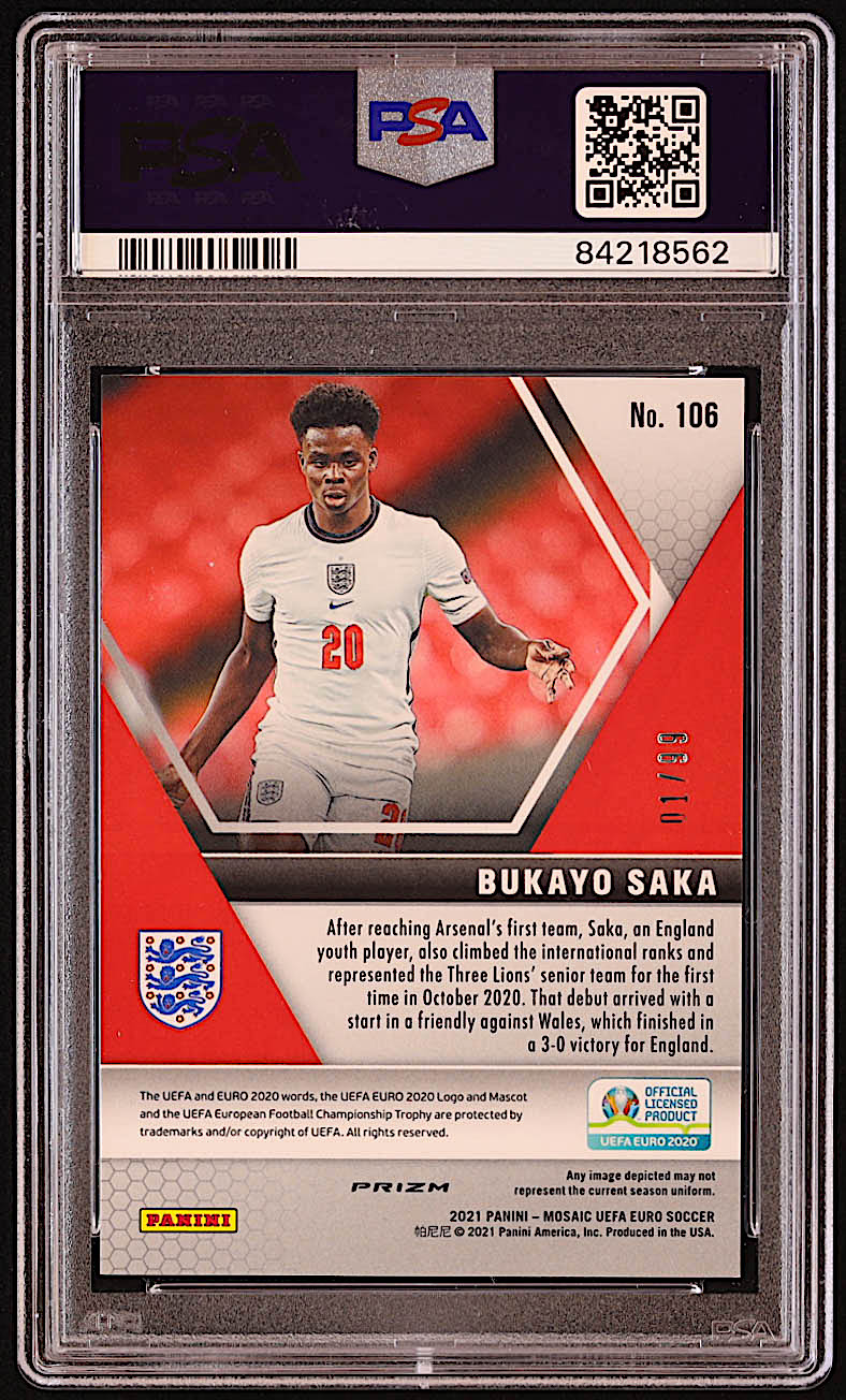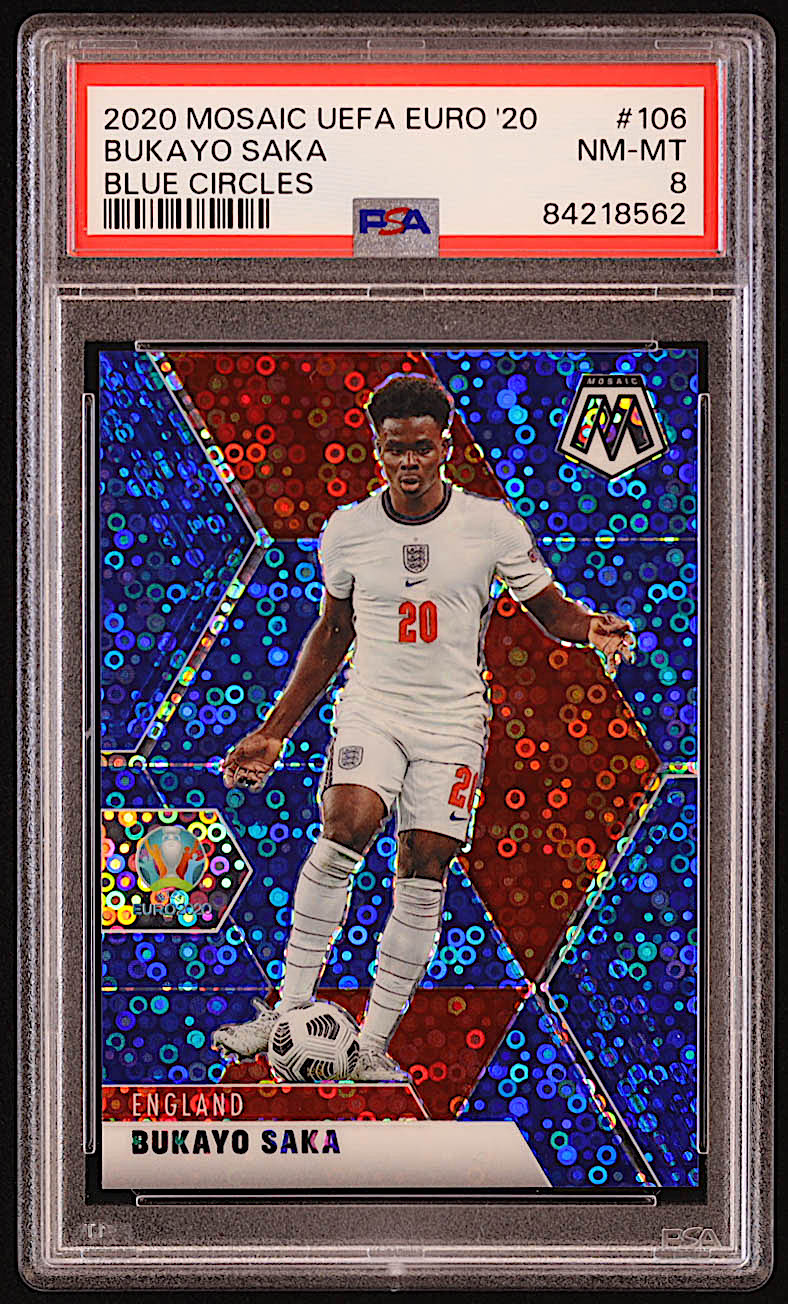 Bukayo Saka 2020-21 Panini Mosaic UEFA Euro Circles Blue #106 #1/99 (PSA 8)