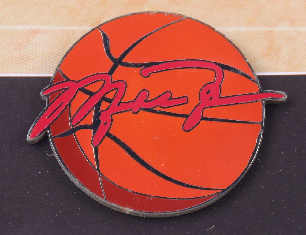 Custom framed photo display measures approximately 13" x 16" in size and features a photo of Michael Jordan (Chicago Bulls, HOF). Display also features a Jordan basketball pin. Please note, the display is unsigned.