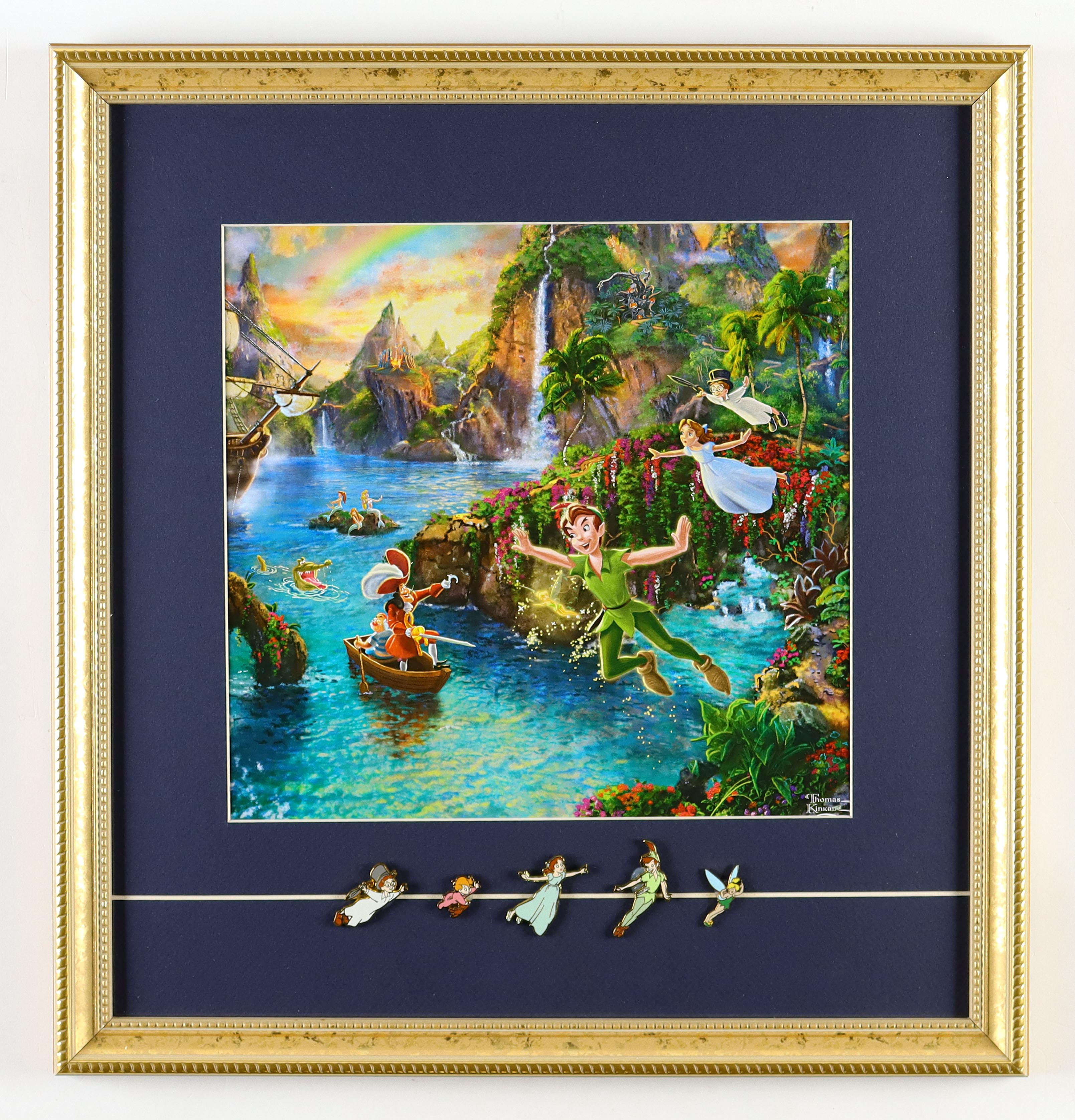 Thomas Kinkade "Peter Pan" Custom Framed Print Display with Set of (5) Peter Pan Flying Pins