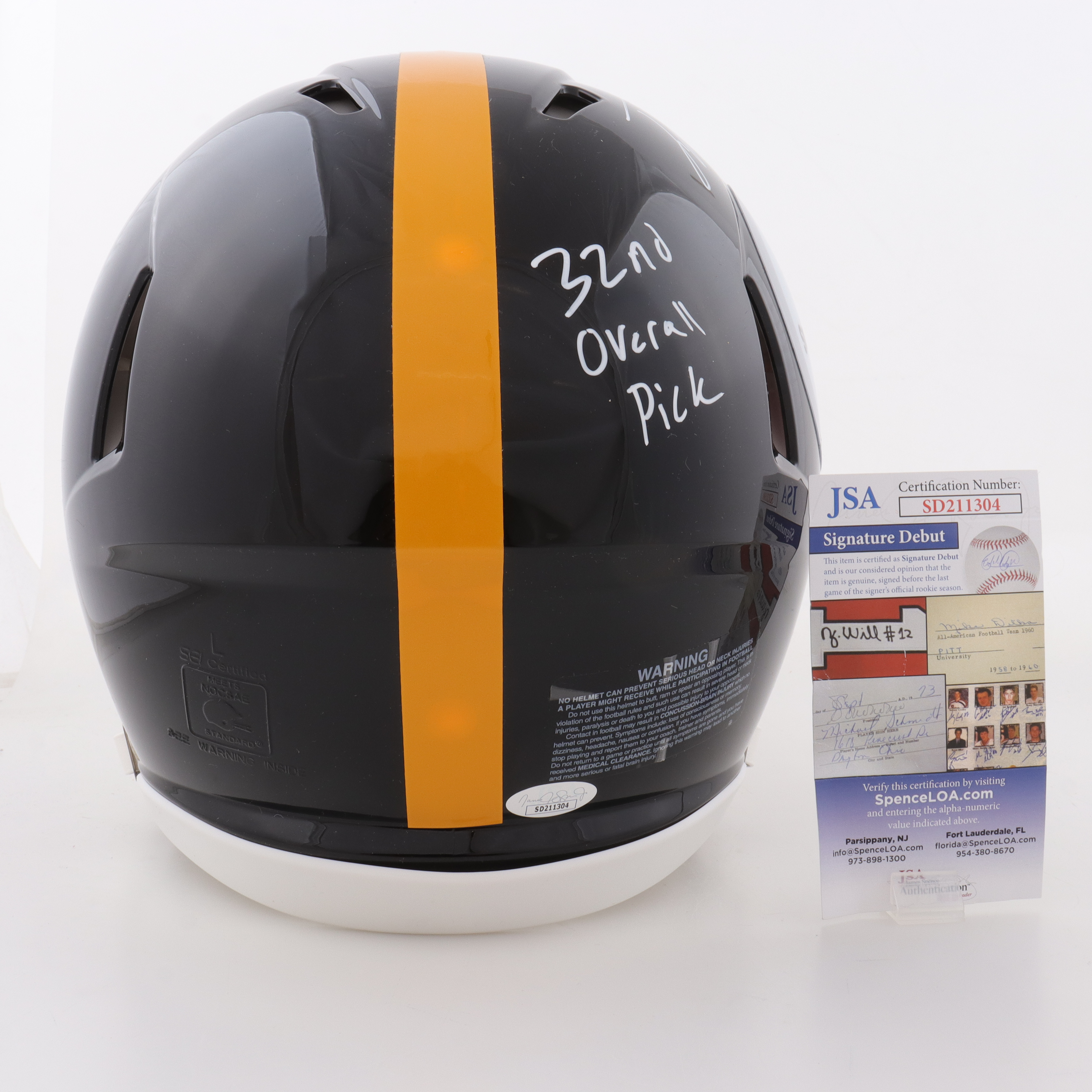 The autograph(s) includes an official James Spence Authentication (JSA) "Signature Debut" hologram and COA. "Signature Debut" is the autographed memorabilia equivalent to a rookie card. The JSA definition of a "Signature Debut" is as follows: "Any item that is autographed and received by JSA prior to the last game of the signer's official rookie season.