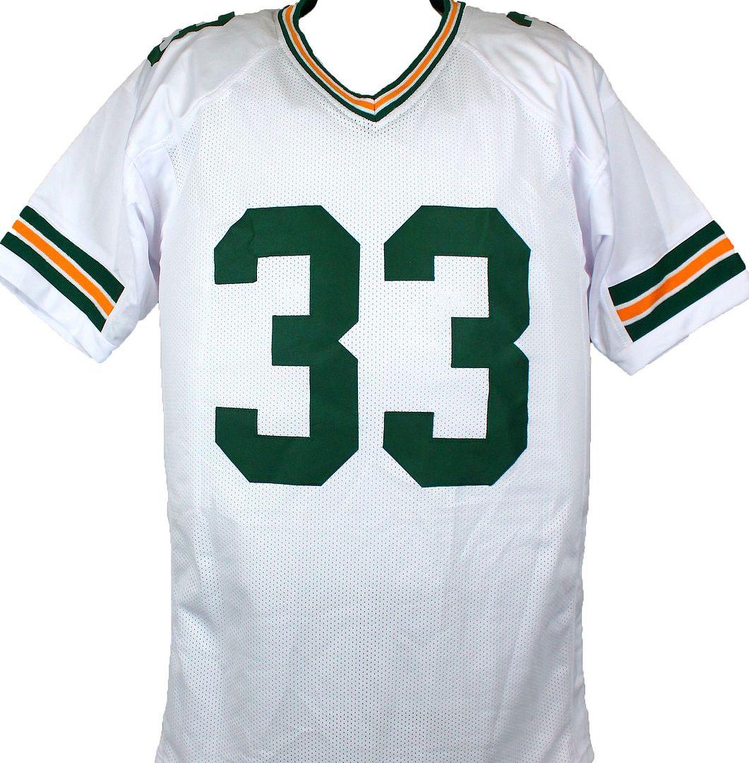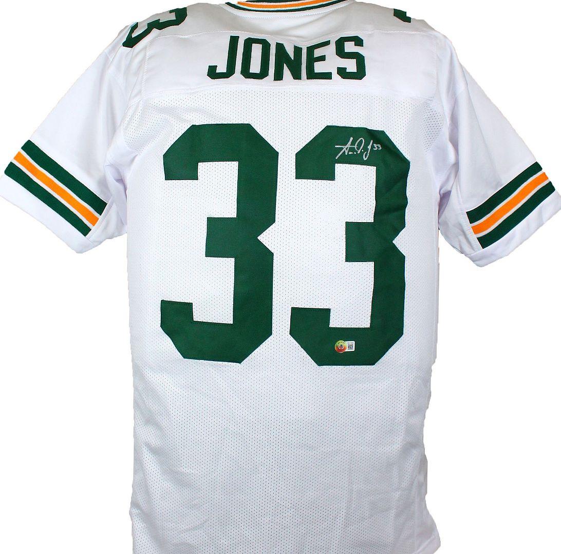 Jersey with everything sewn on, size XL. Hand-signed by Aaron Jones.