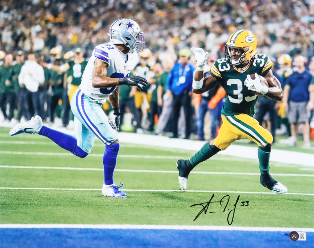 Photo measures 16" x 20" in size and has been hand-signed by Aaron Jones (Green Bay Packers).