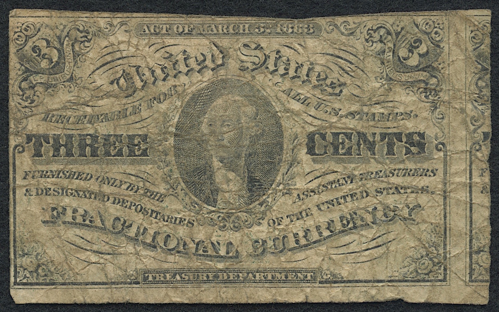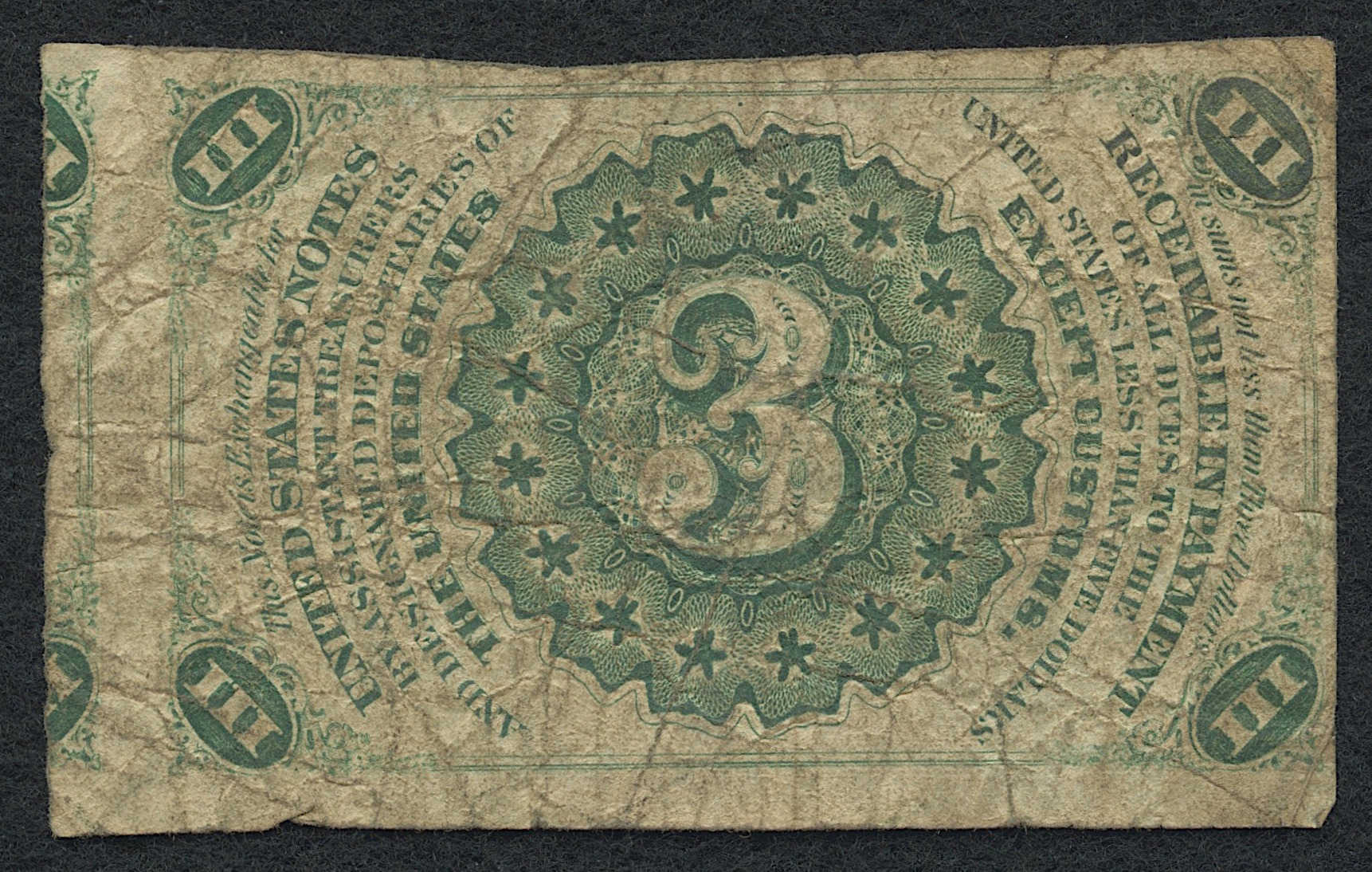 Fractional currency, also referred to as shinplasters, was introduced by the United States federal government following the outbreak of the Civil War. These fractional notes were in use between 21 August 1862 and 15 February 1876, and issued in 3, 5, 10, 15, 25, and 50 cent denominations across five issuing periods.