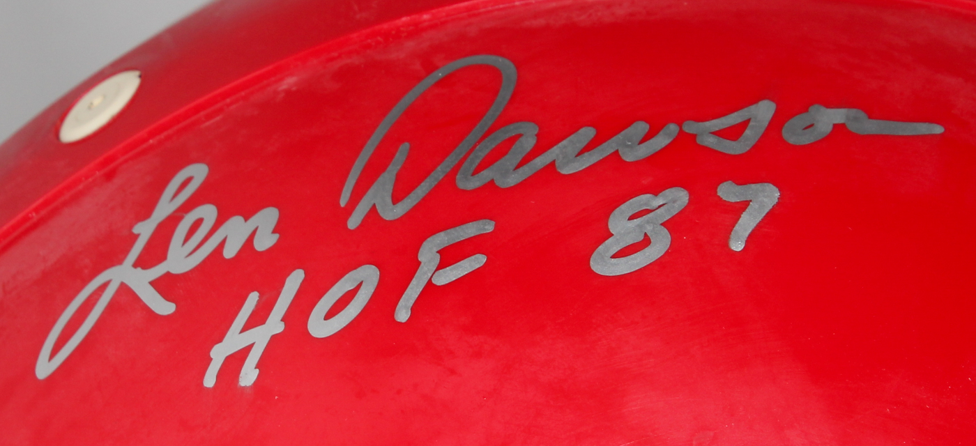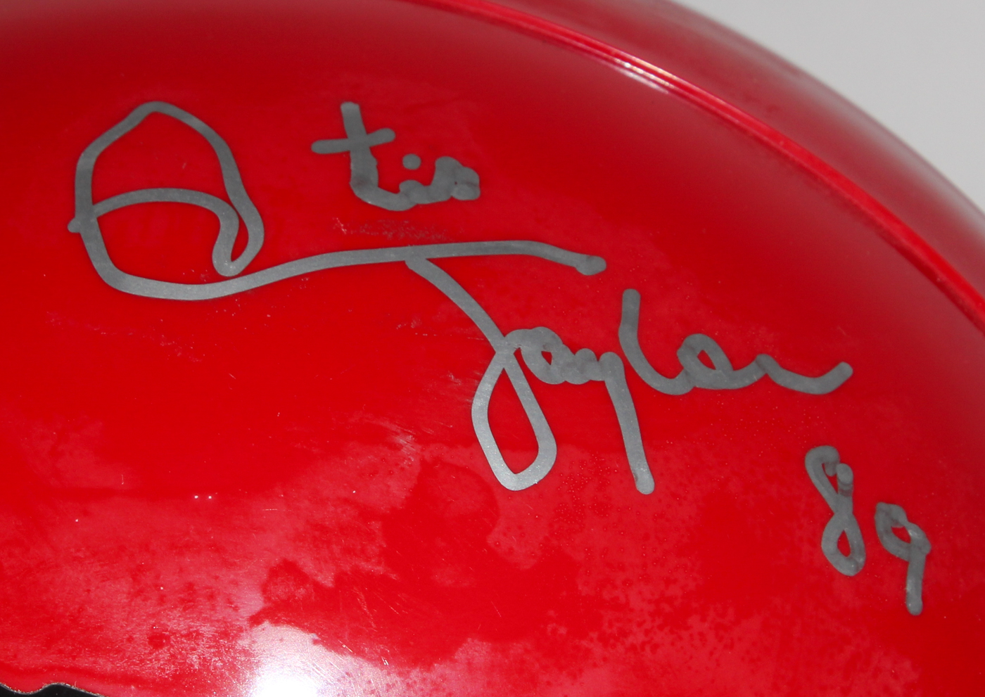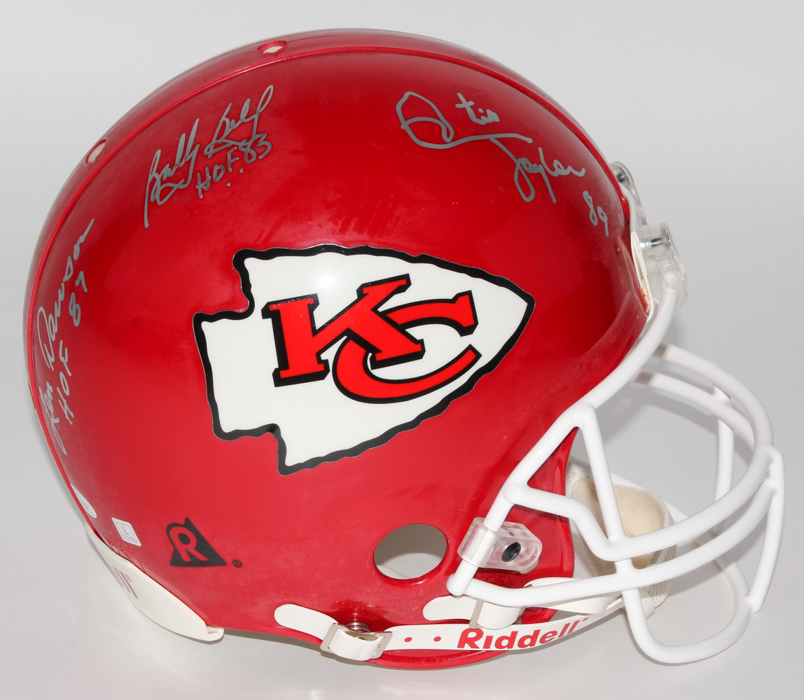 Riddell full-size authentic proline helmet hand-signed and inscribed in silver paint-pen by Len Dawson (HOF), Bobby Bell (HOF) and Otis Taylor. Please note, there is residue and a stray pen mark on the helmet, see photos for details.