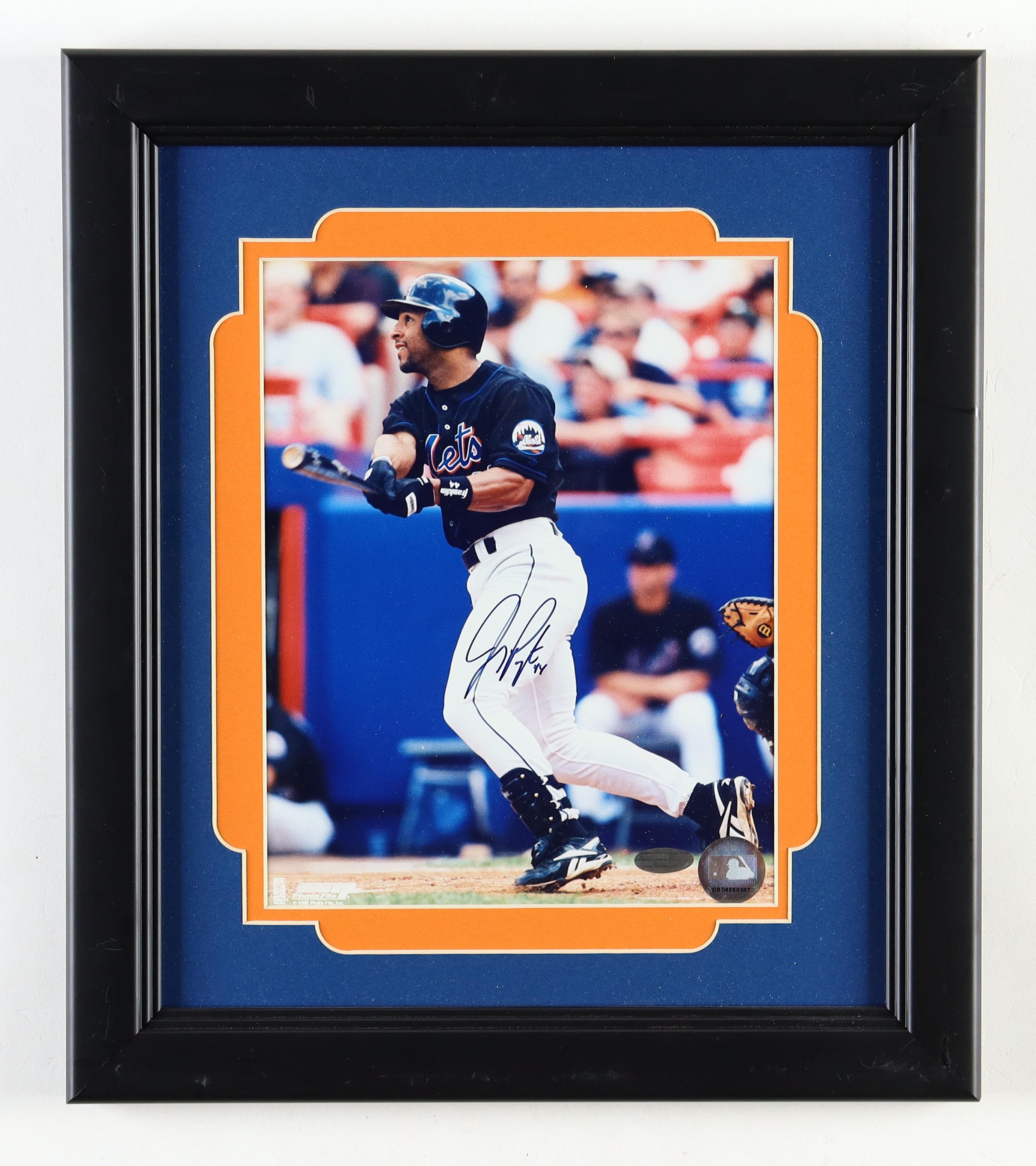 Custom frame measures approximately 13.5" x 15.5" in size and features a photo that has been hand-signed by Jay Payton (New York Mets). Please note, there are is scuffing on the frame.