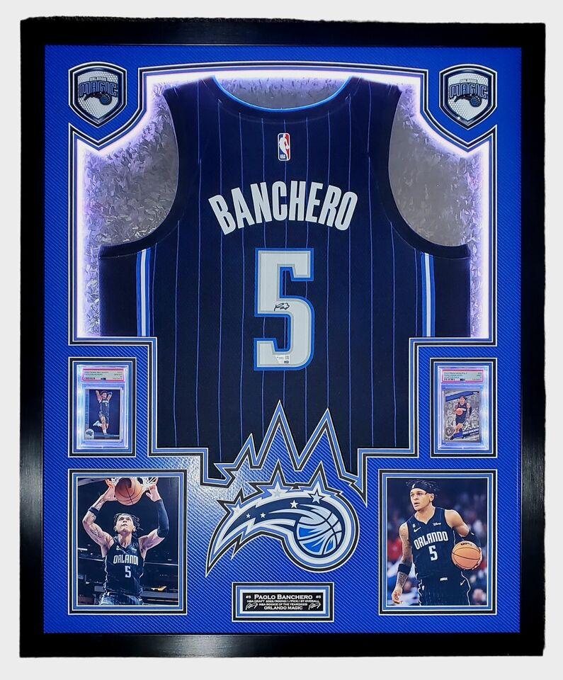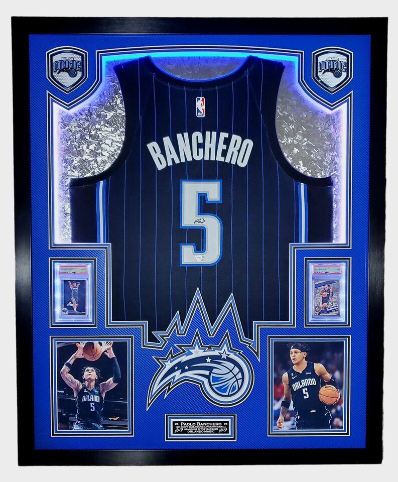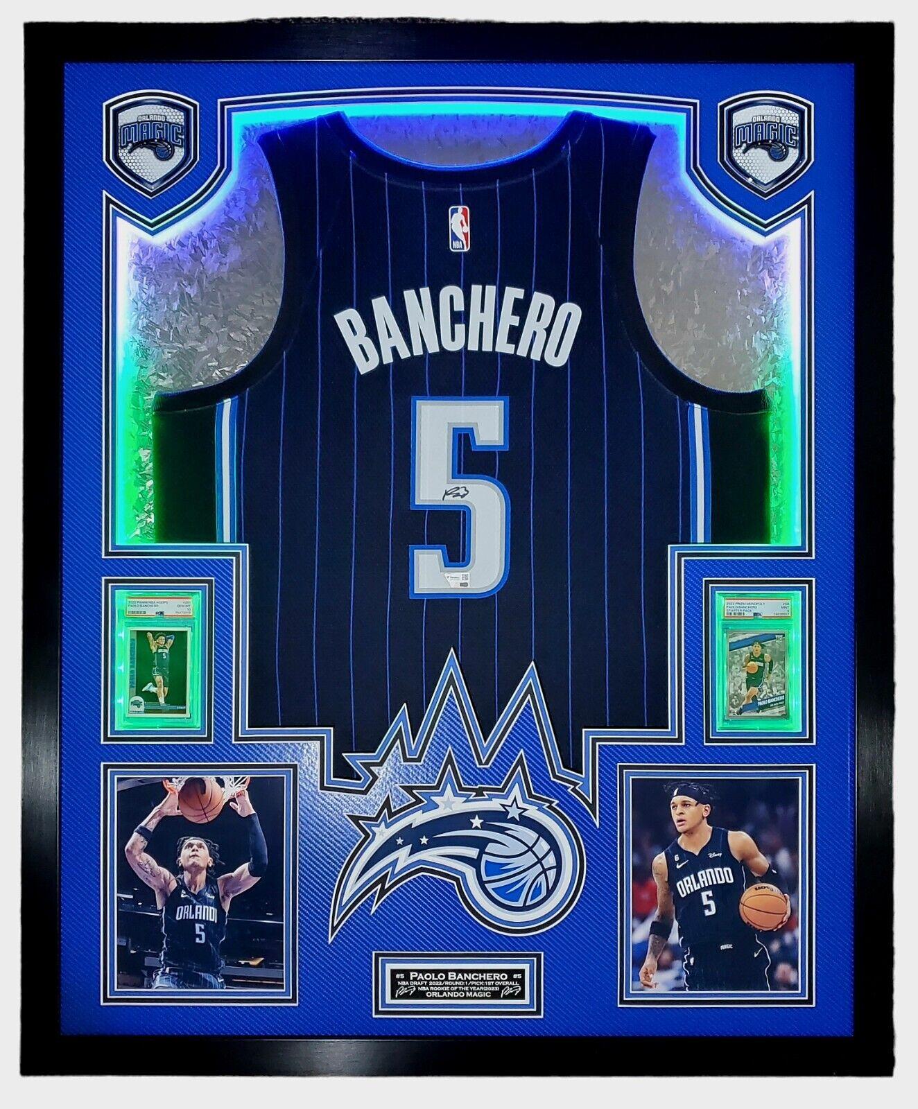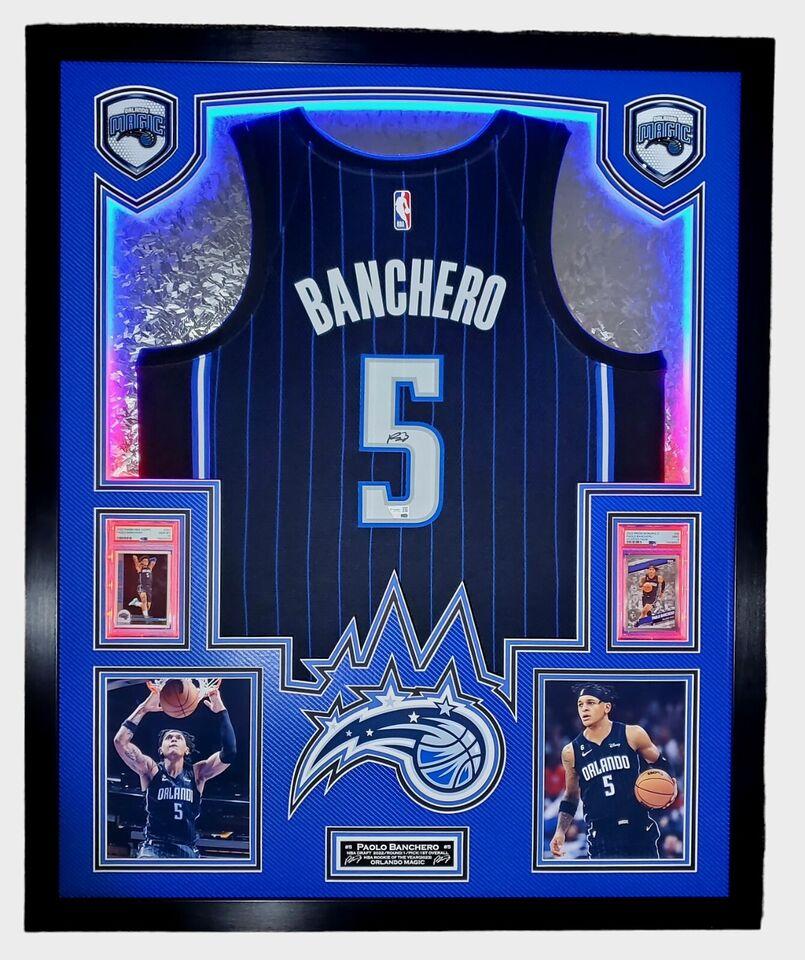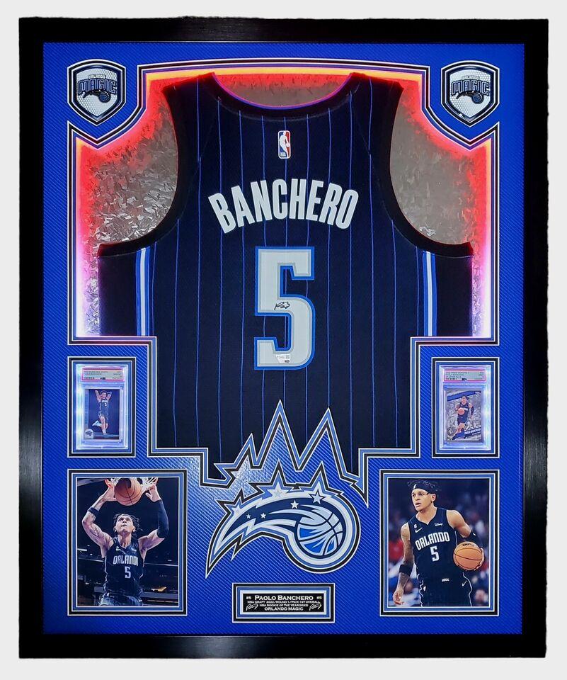 Custom frame measures 33" x 42" in size and comes installed with customizable LED backlighting. The frame features a Nike Swingman jersey that has been hand-signed by Paolo Banchero (Orlando Magic).