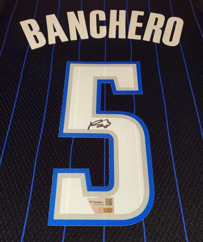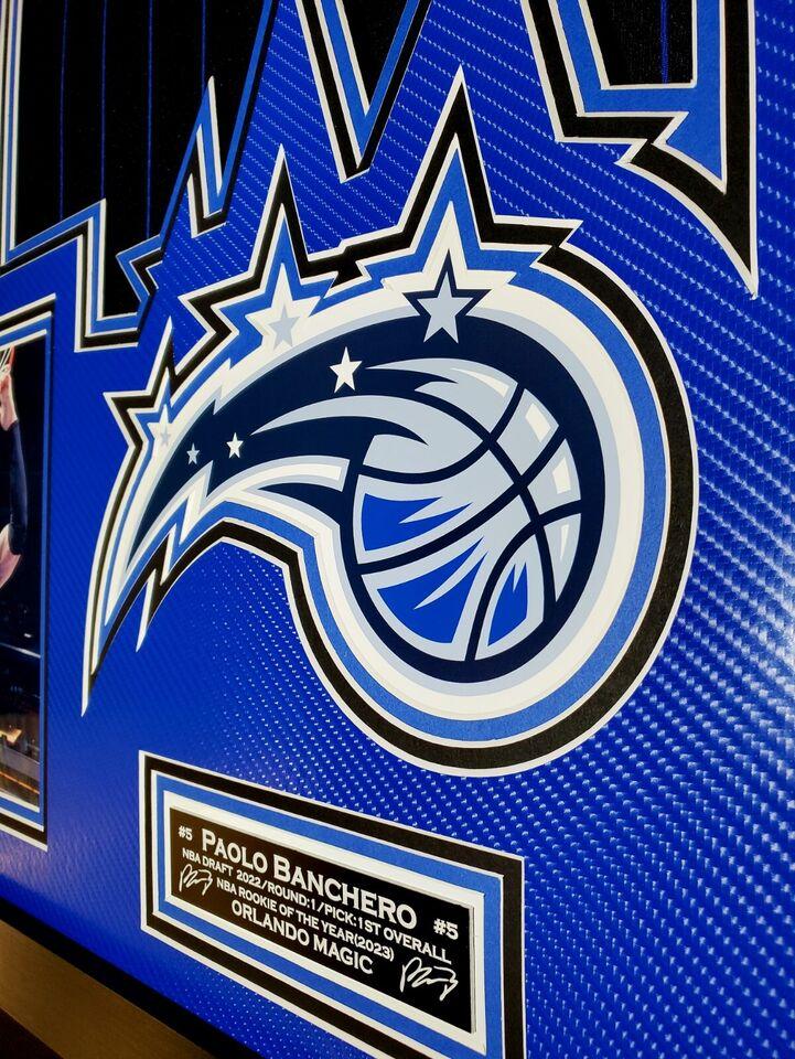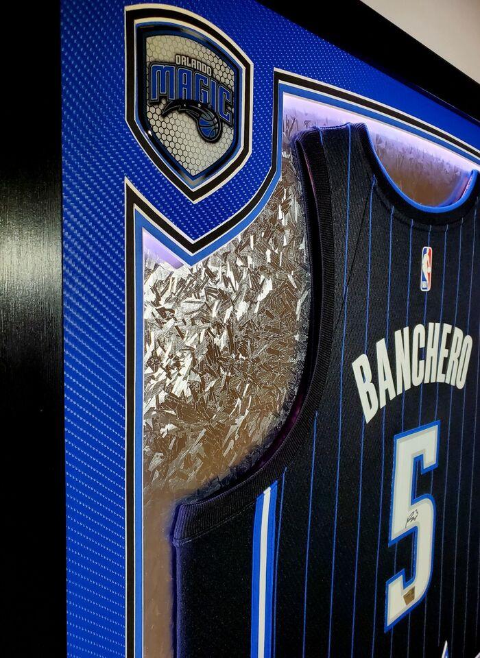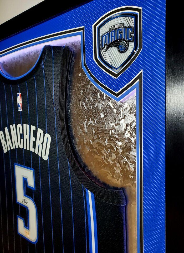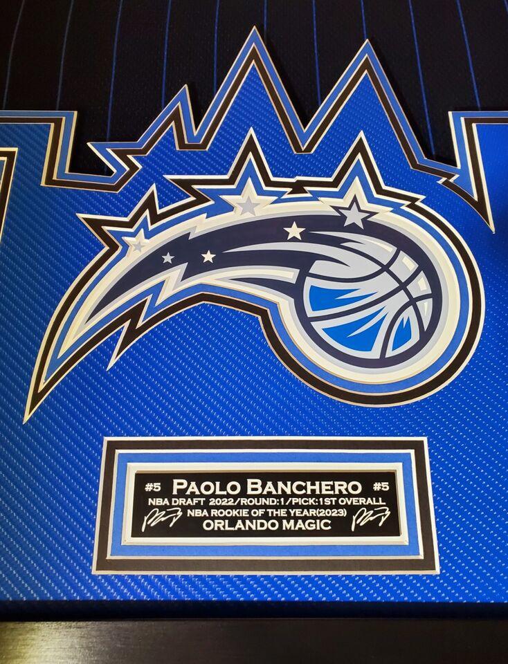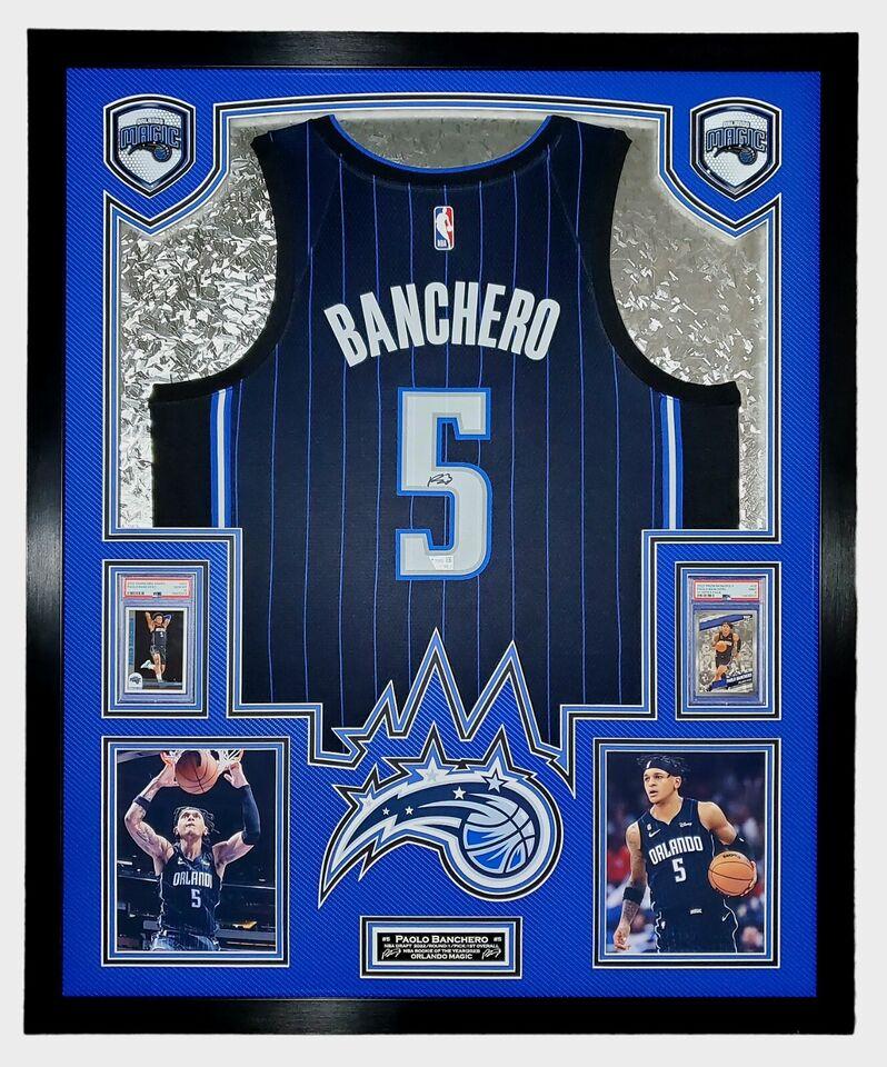 Custom frame measures 33" x 42" in size and comes installed with customizable LED backlighting. The frame features a Nike Swingman jersey that has been hand-signed by Paolo Banchero (Orlando Magic).