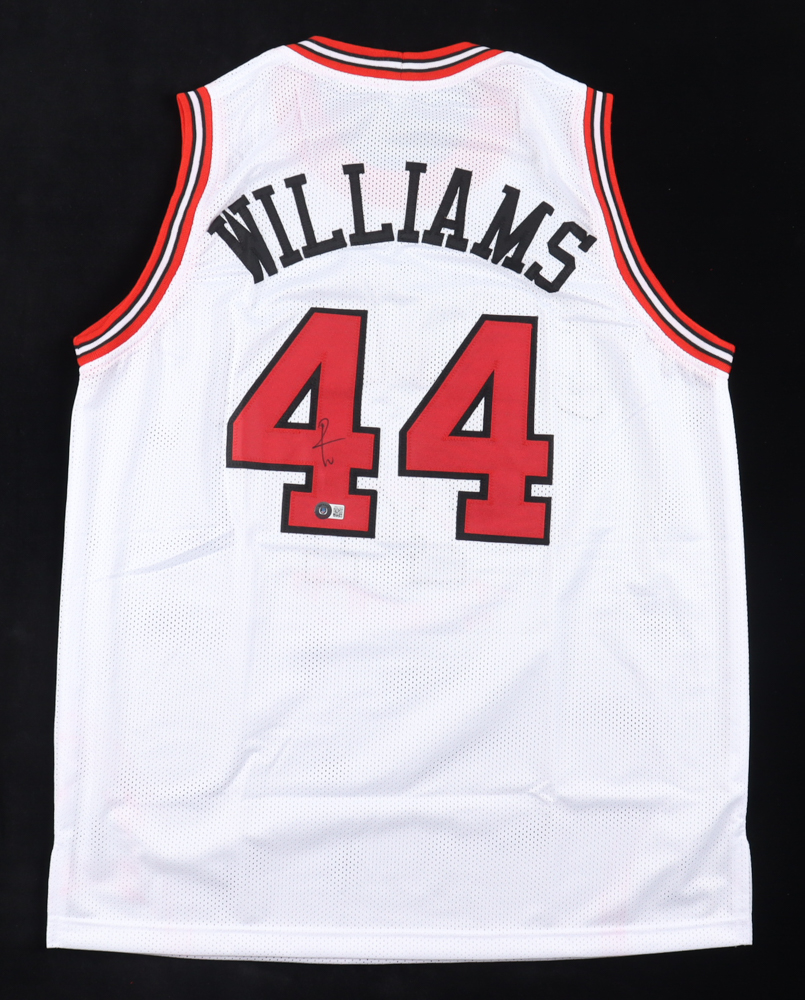 Custom jersey. Everything is sewn on, size XL. Hand-signed by Patrick Williams. Please note, there are red stains on the front, the collar, near the reverse number, and back of the jersey. Please refer to the photos for the condition of the item.