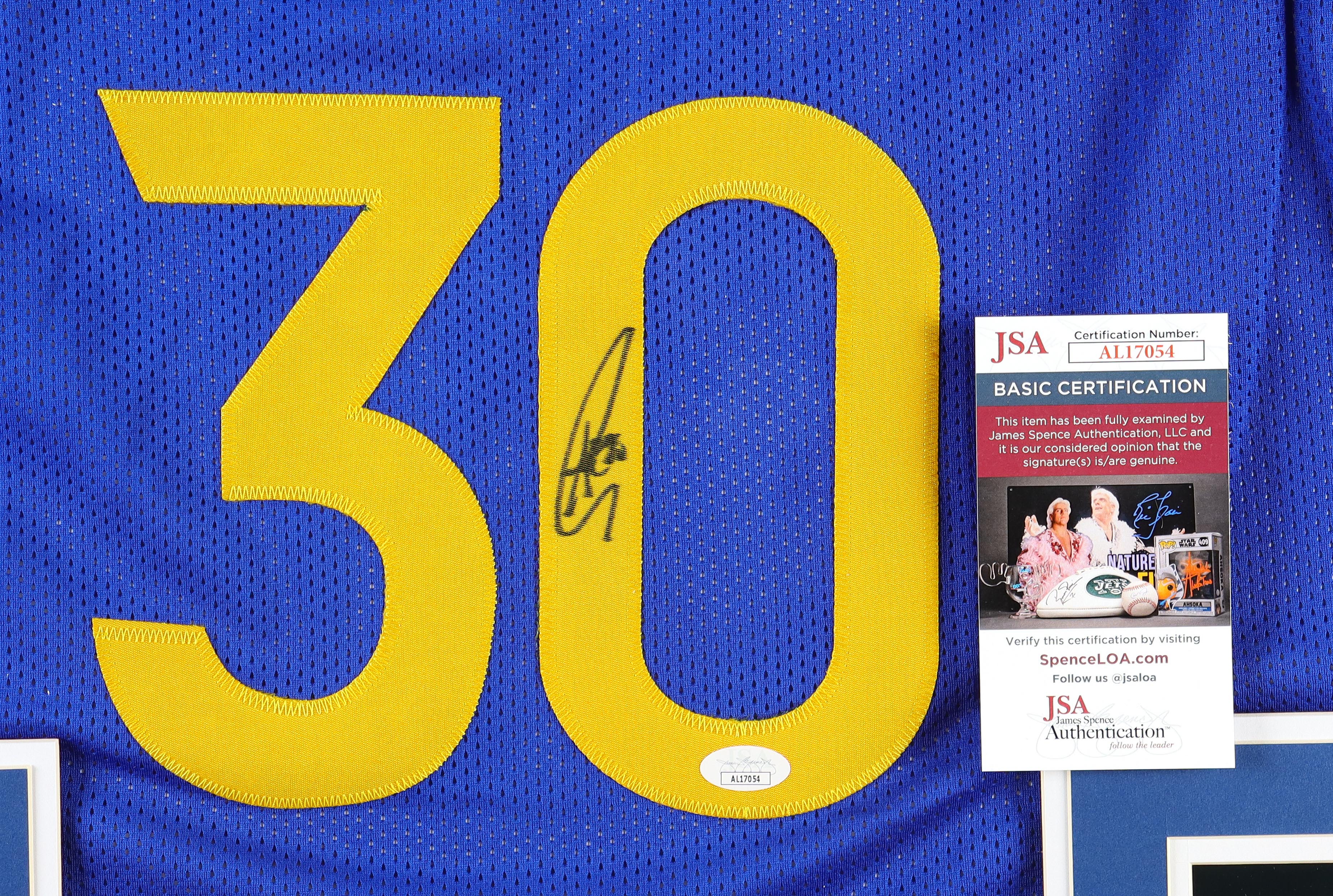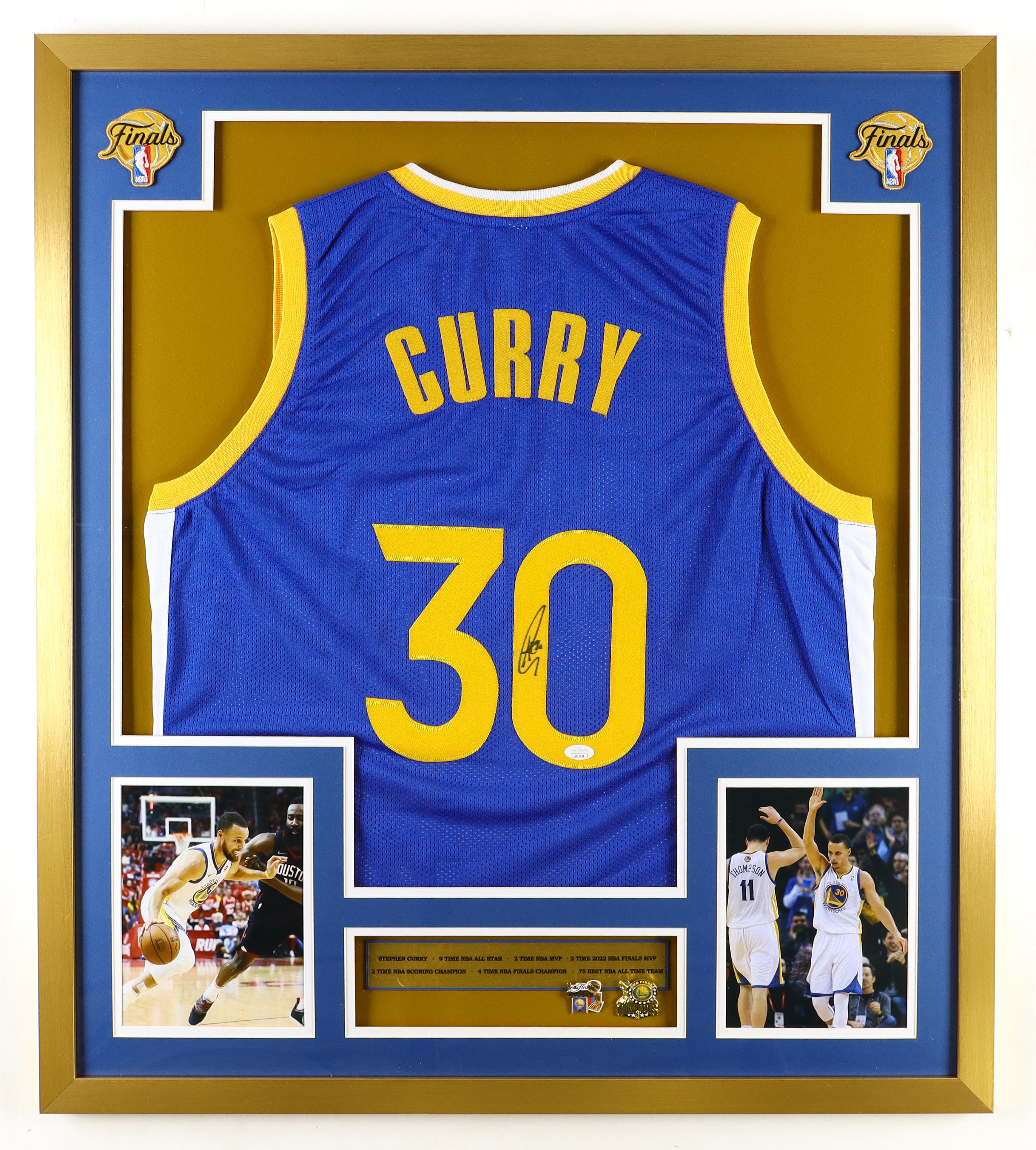 Custom frame measures approximately 32" x 36" in size and features a jersey hand-signed by Stephen Curry. The display also includes (2) Championship pins as well as (2) cloth logo patches and (2) photos.