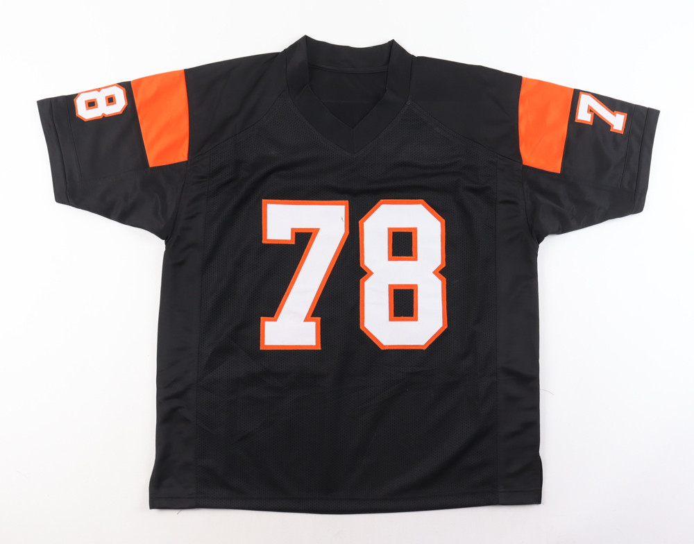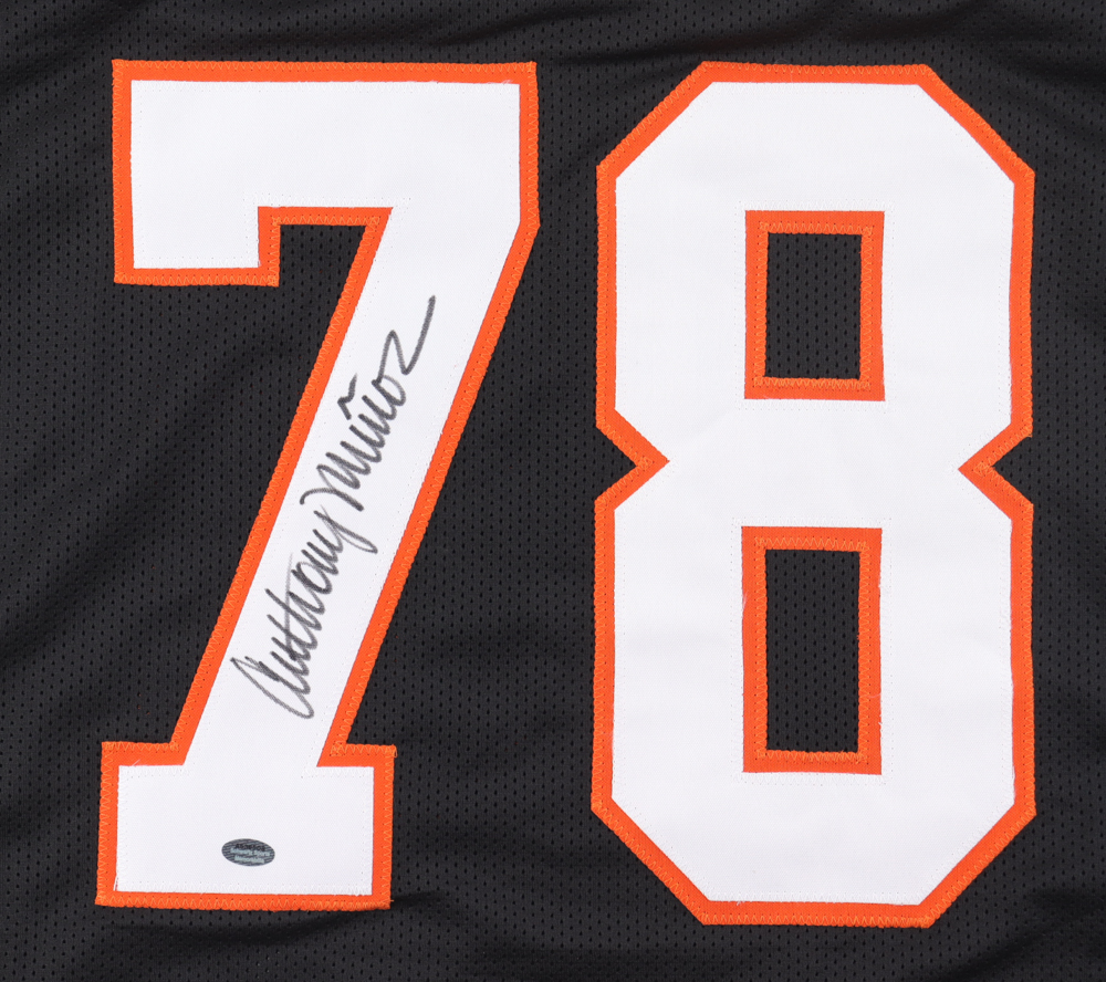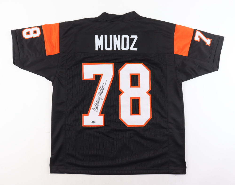 Custom jersey with everything sewn on, size XL. Hand-signed by Anthony Munoz (HOF).