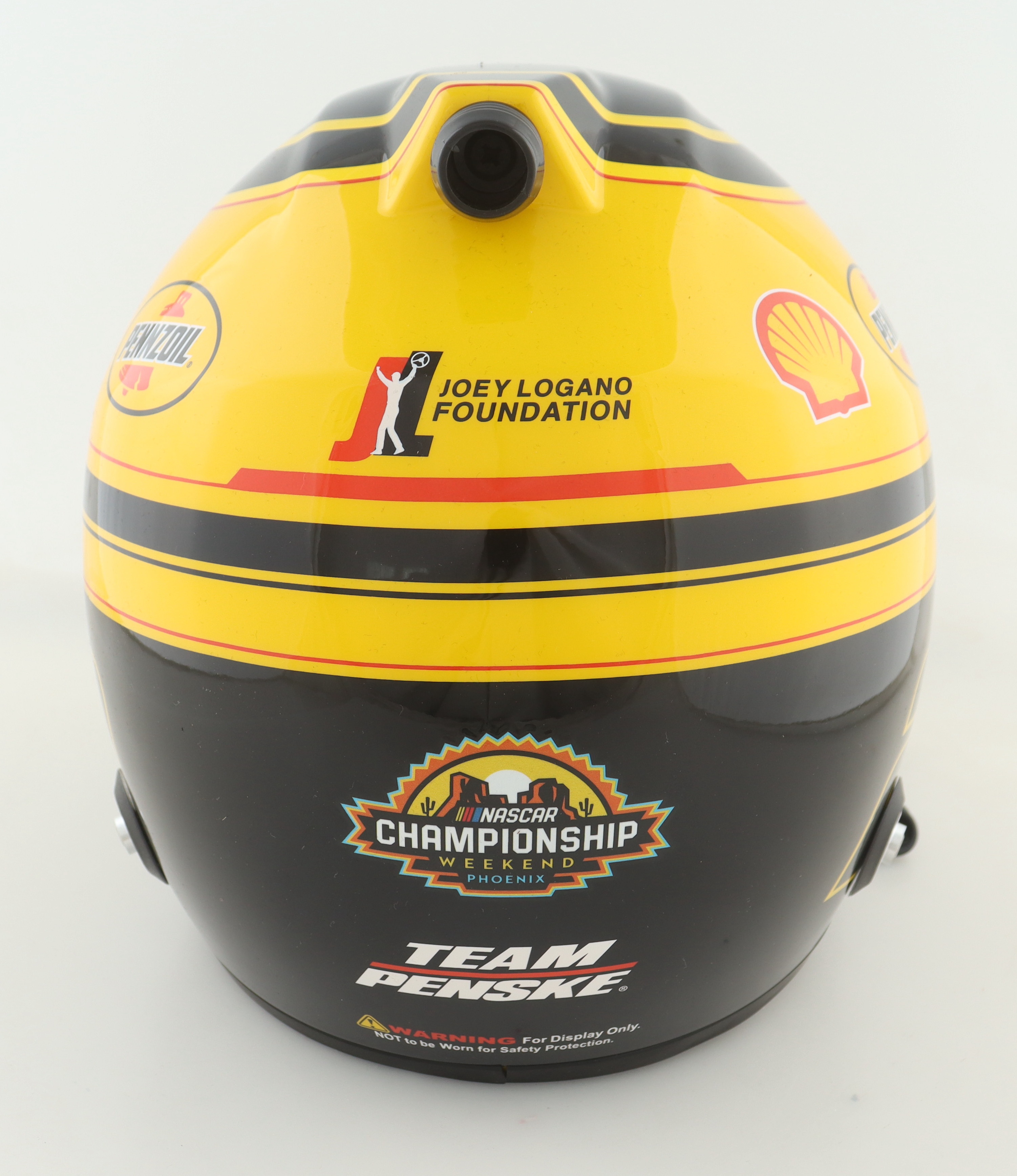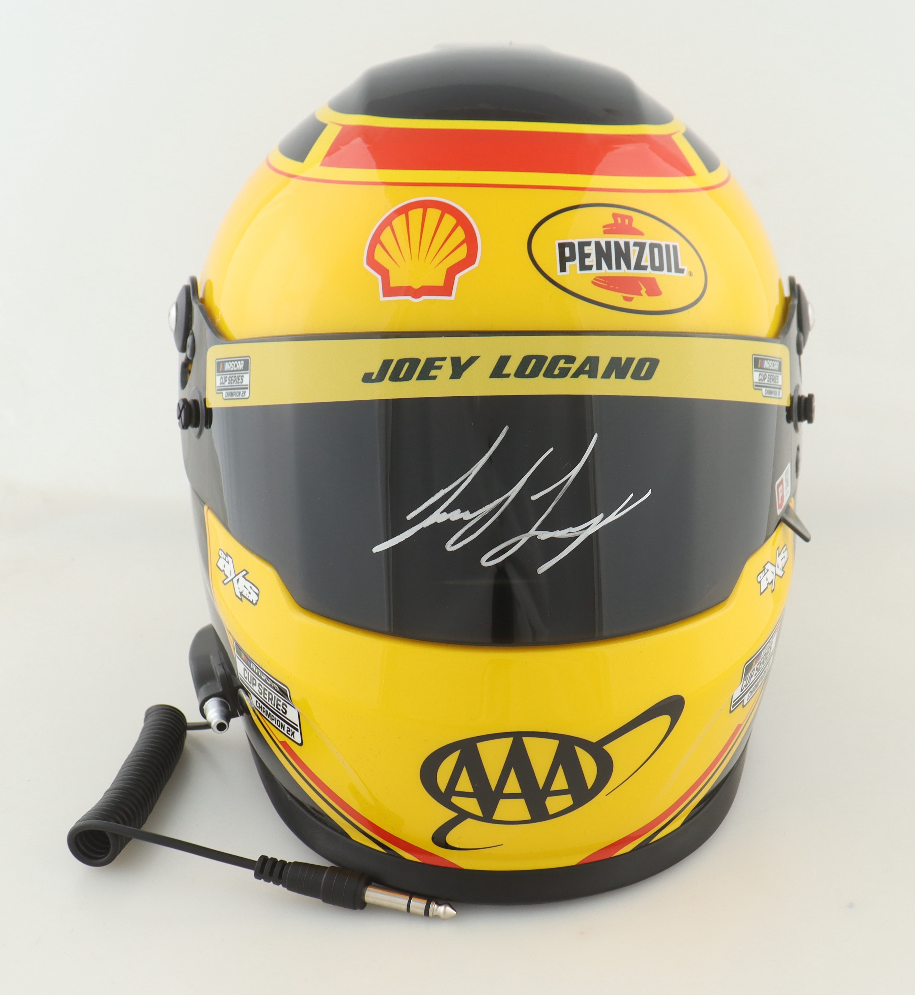 Full-size replica NASCAR helmet is hand-signed on the visor by Joey Logano.