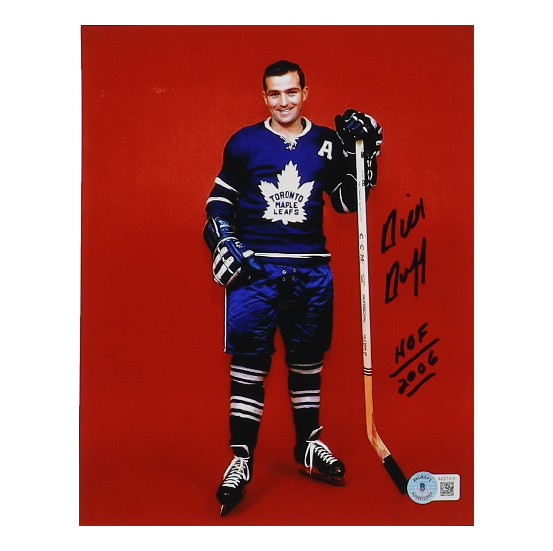 Photo measures 8" x 10" in size and has been hand-signed and inscribed by Dick Duff (Toronto Maple Leafs, HOF).