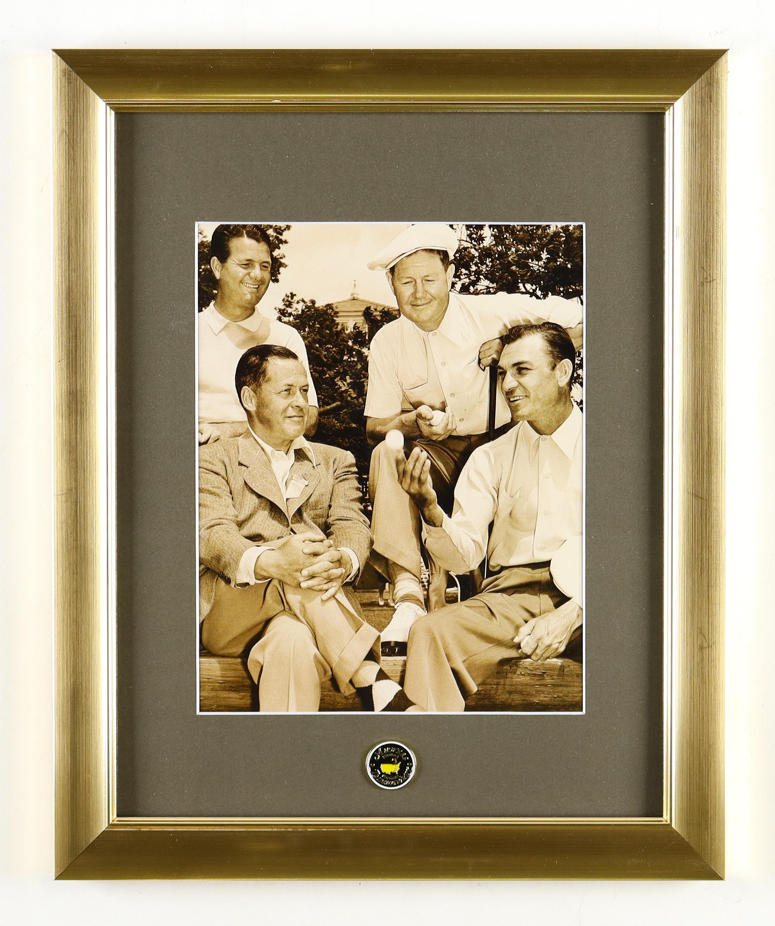 Custom frame measures approximately 13" x 16" in size and features an unsigned photo featuring Bobby Jones (D. 1971, HOF), Ben Hogan (D. 1997, HOF), Sam Snead (D. 2002, HOF) and also includes official Masters Tournament pin. Please note, the display is unsigned.