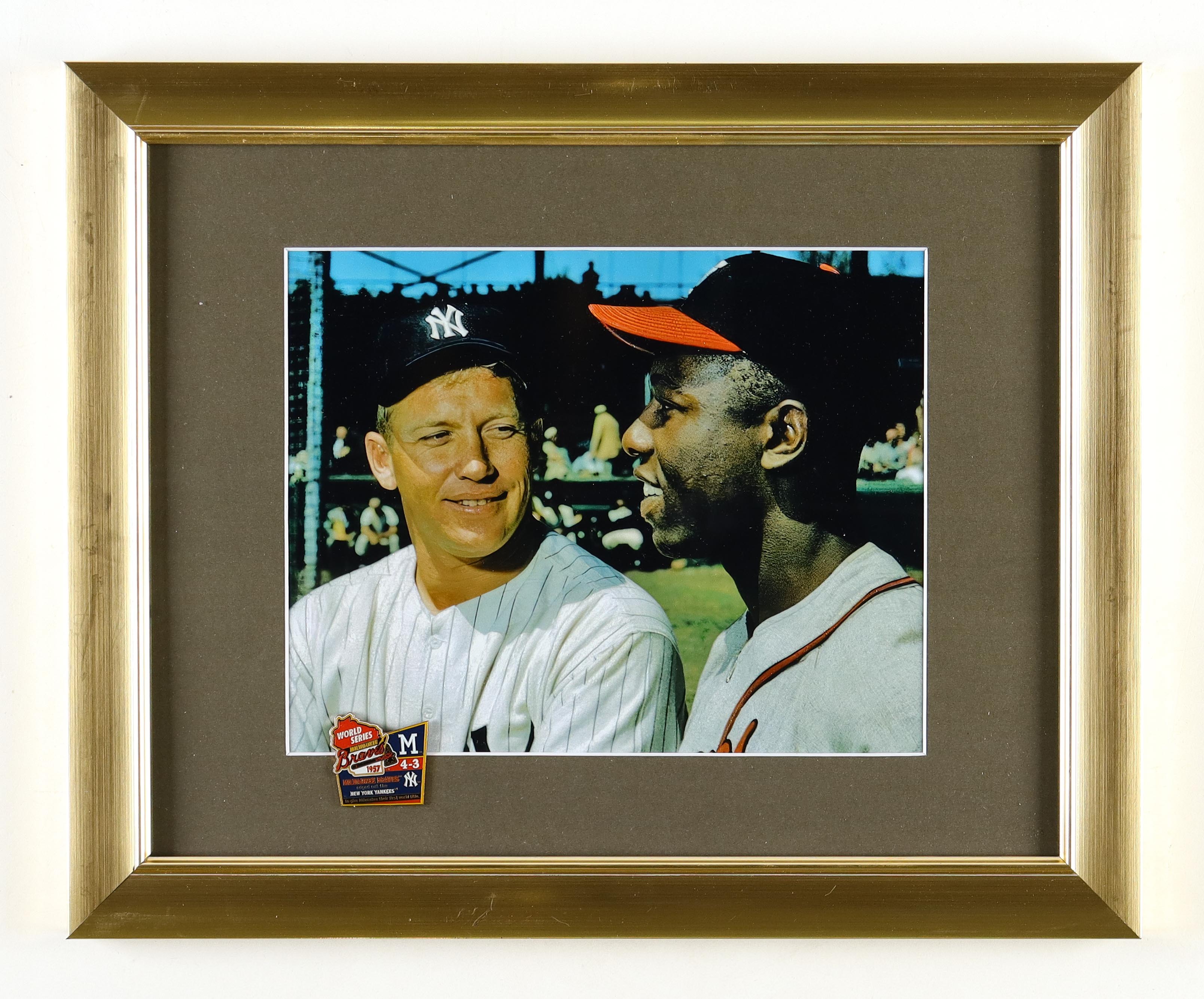 Custom frame measures approximately 13" x 16" in size and features an unsigned photo of Mickey Mantle (D. 1995, New York Yankees, HOF) and Hank Aaron (D. 2021, Milwaukee Braves, HOF). The display also includes a 1957 Official World Series pin. Please note, the display is unsigned and there is scuffing on the frame.