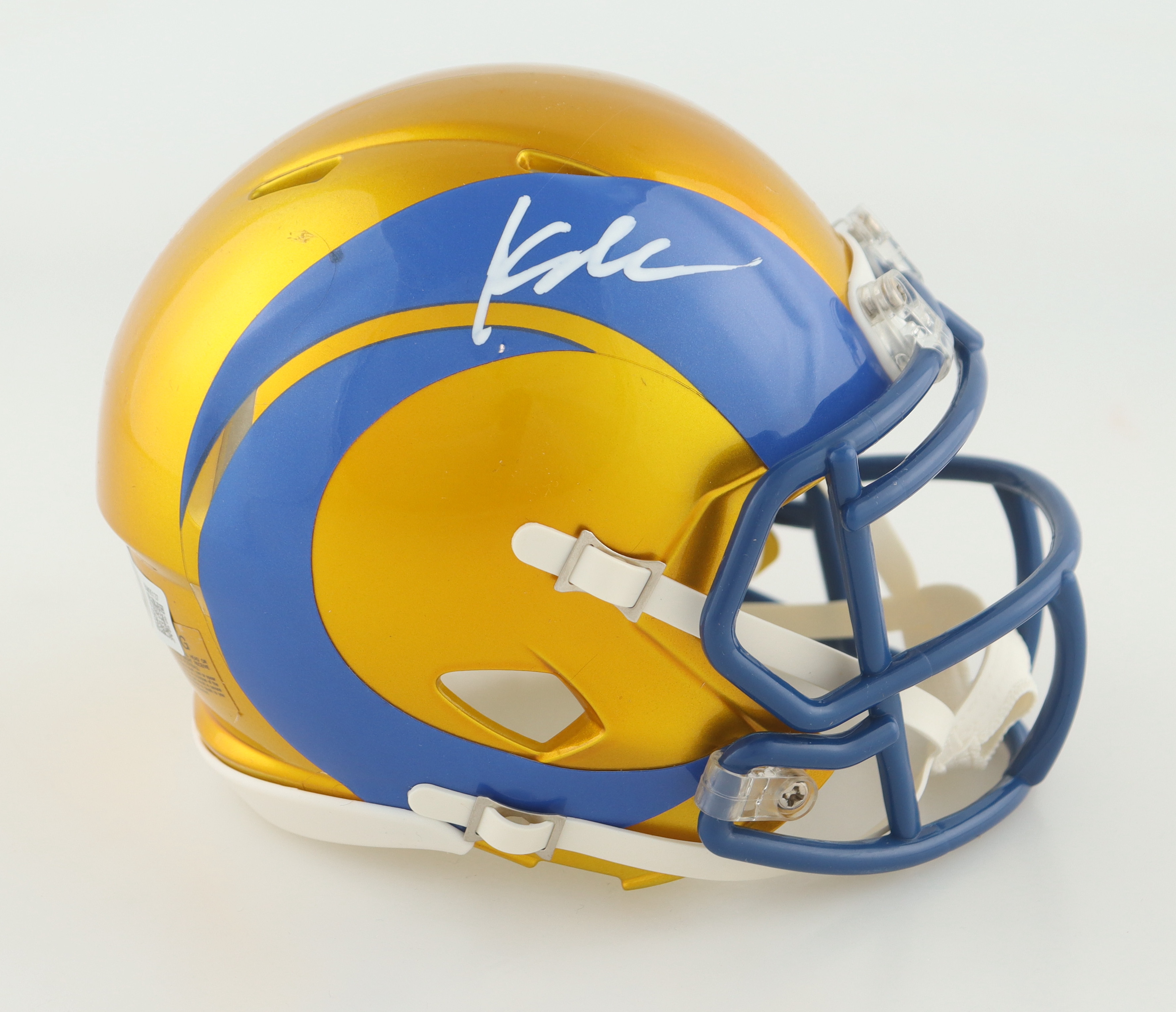 Riddell Los Angeles Rams flash alternate speed mini helmet has been hand-signed by Kyren Williams.