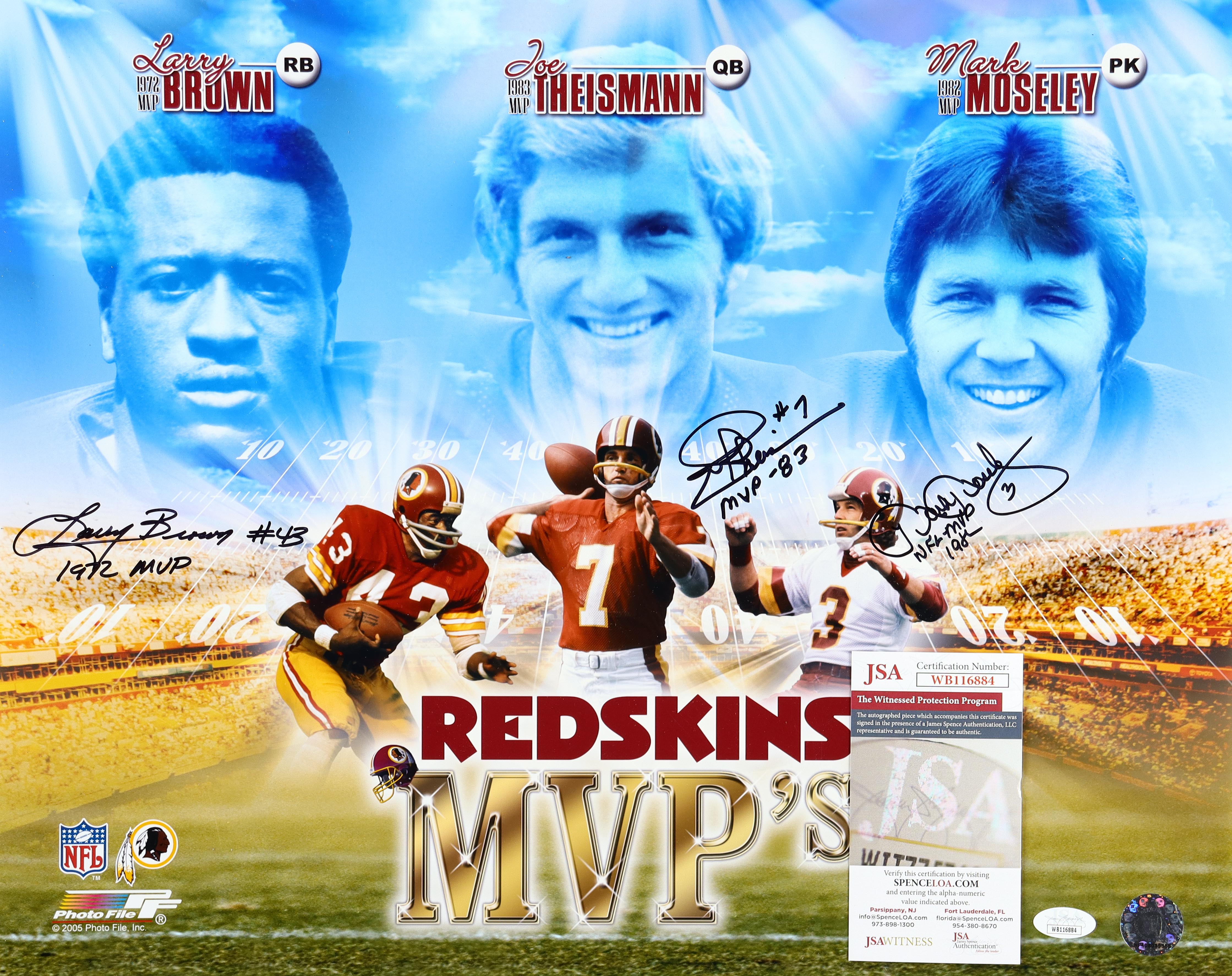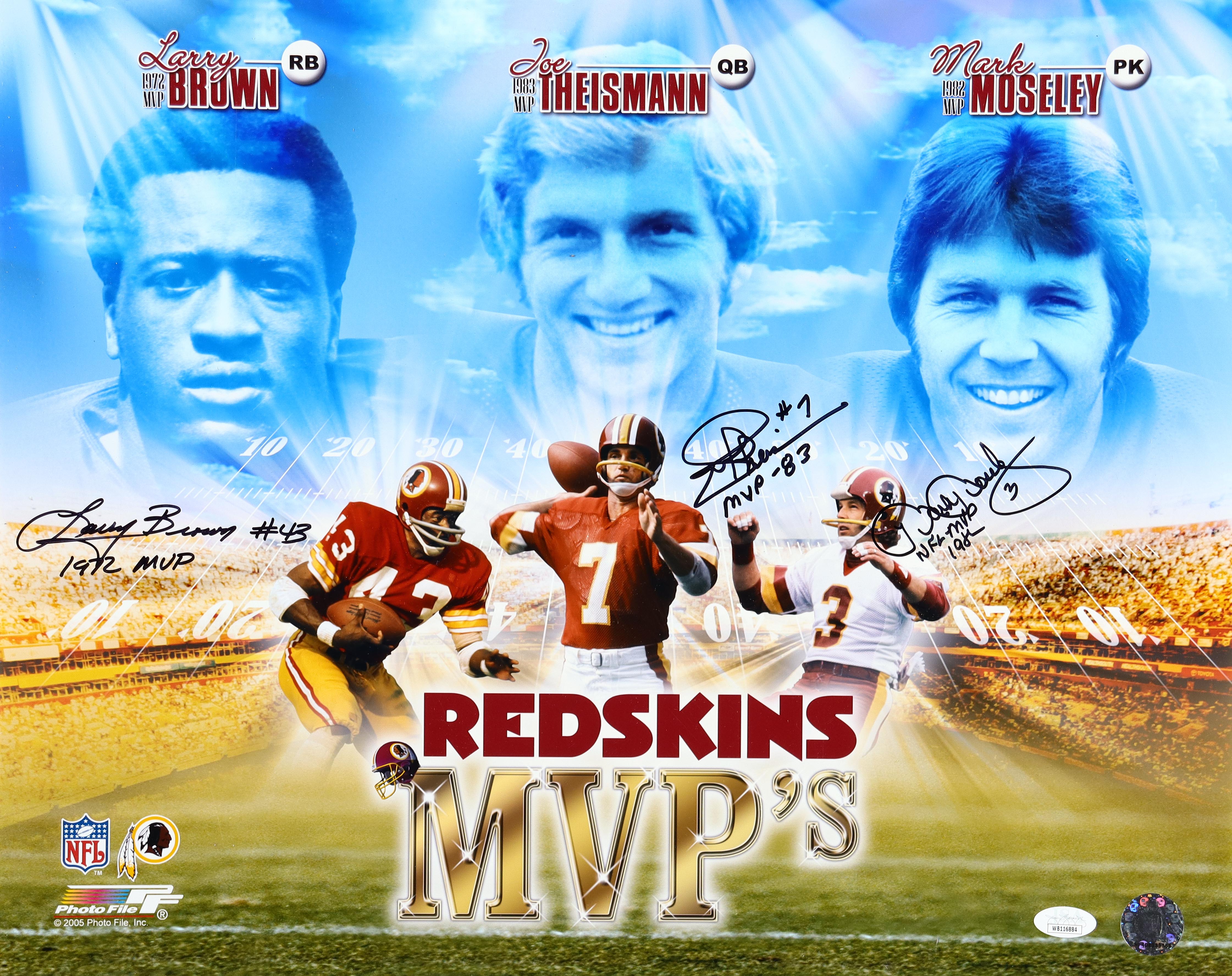 Photo measures approximately 16" x 20" in size and has been hand-signed by Joe Theismann, Larry Brown, and Mark Moseley (Washington Redskins).