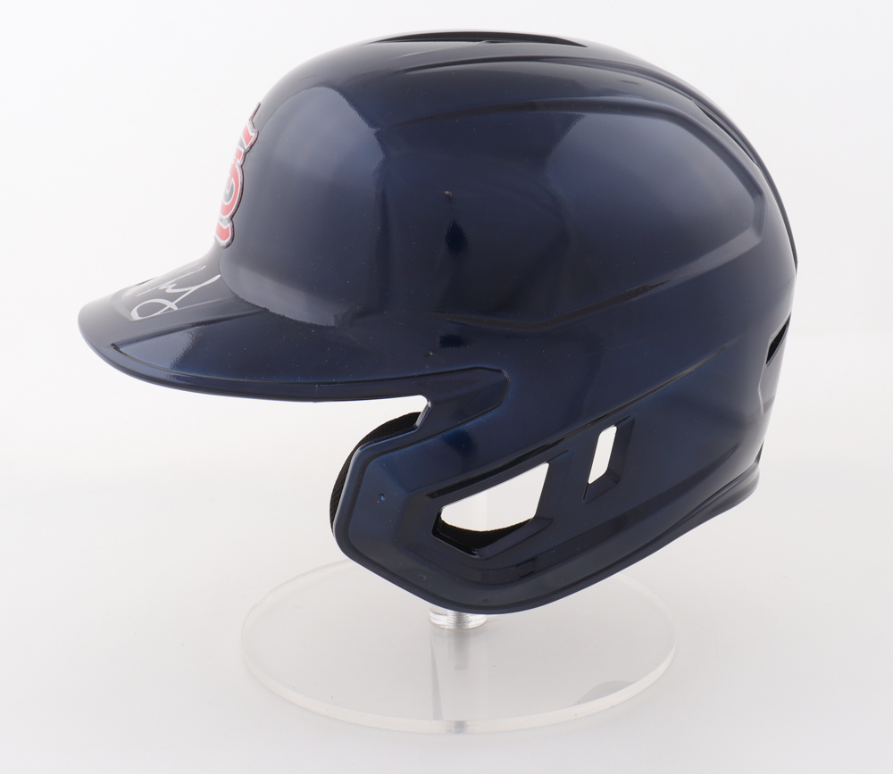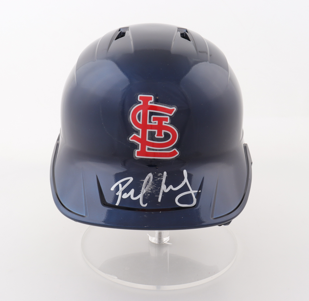 St. Louis Cardinals full-size souvenir replica batting helmet. Hand-signed by Paul Goldschmidt. Please note, there is scuffing on the helmet, the autograph is smudged and the display stand is not included as shown.