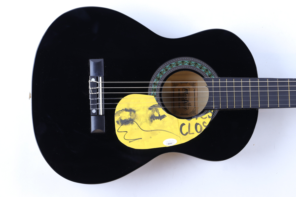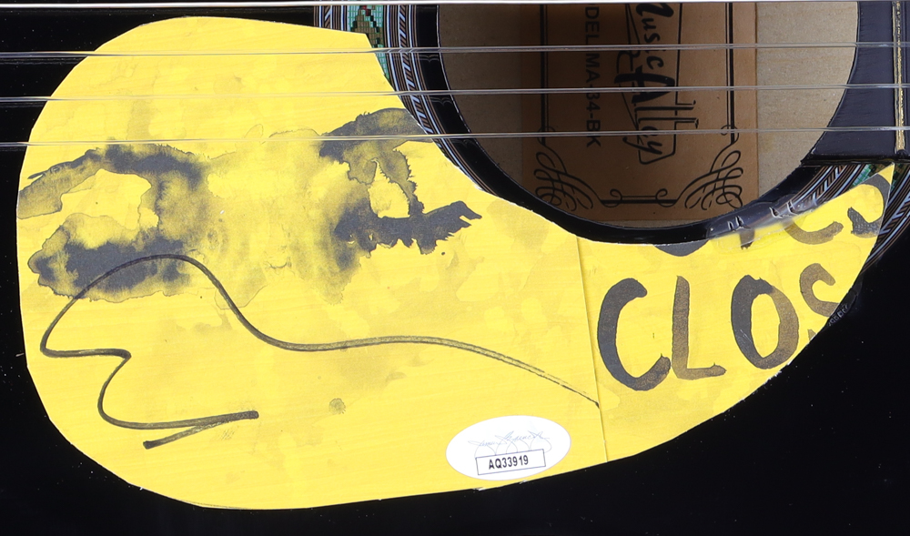 Music Alley Guitar measures approximately 34" in length. Hand-signed on a CD cover that has been repurposed as a pick-guard by Ed Sheeran.