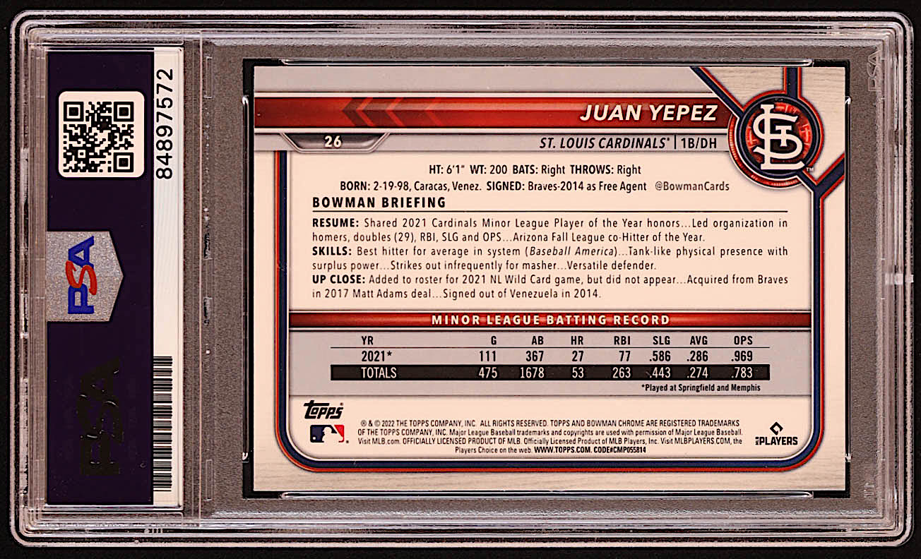 Juan Yepez Signed 2022 Bowman Chrome #26 RC (PSA)