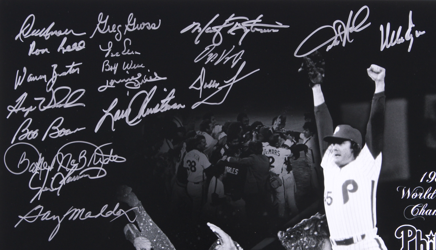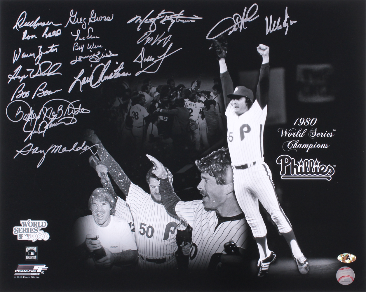 Photo measures 16" x 20" and has been hand signed in silver paint pen by (18) members of the 1980 Phillies with Bob Boone, Warren Brusstar, Marty Bystrom, Larry Christenson, Lee Elia, Dallas Green, Greg Gross, Garry Maddox, Bake McBride, Keith Moreland, Ron Reed, Mike Ryan, Lonnie Smith, Del Unser, Ozzie Virgil, George Vukovich and Bobby Wine.