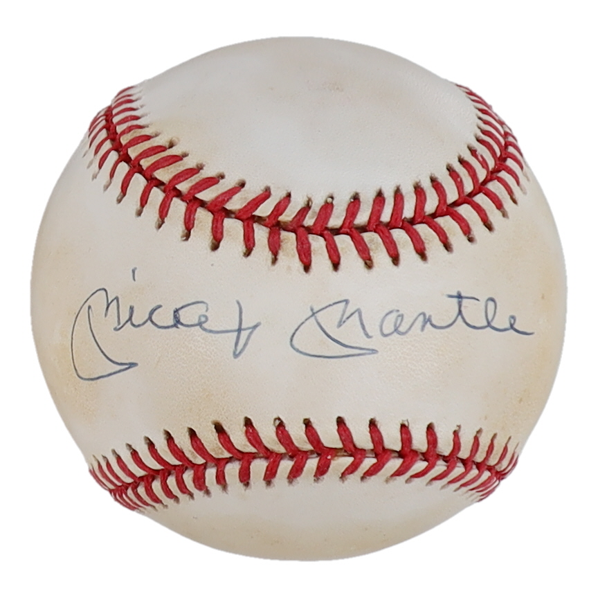 Rawlings Official American League baseball. Hand-signed by Mickey Mantle (D. 1995, New York Yankees, HOF). Please note, the baseball is naturally toned.