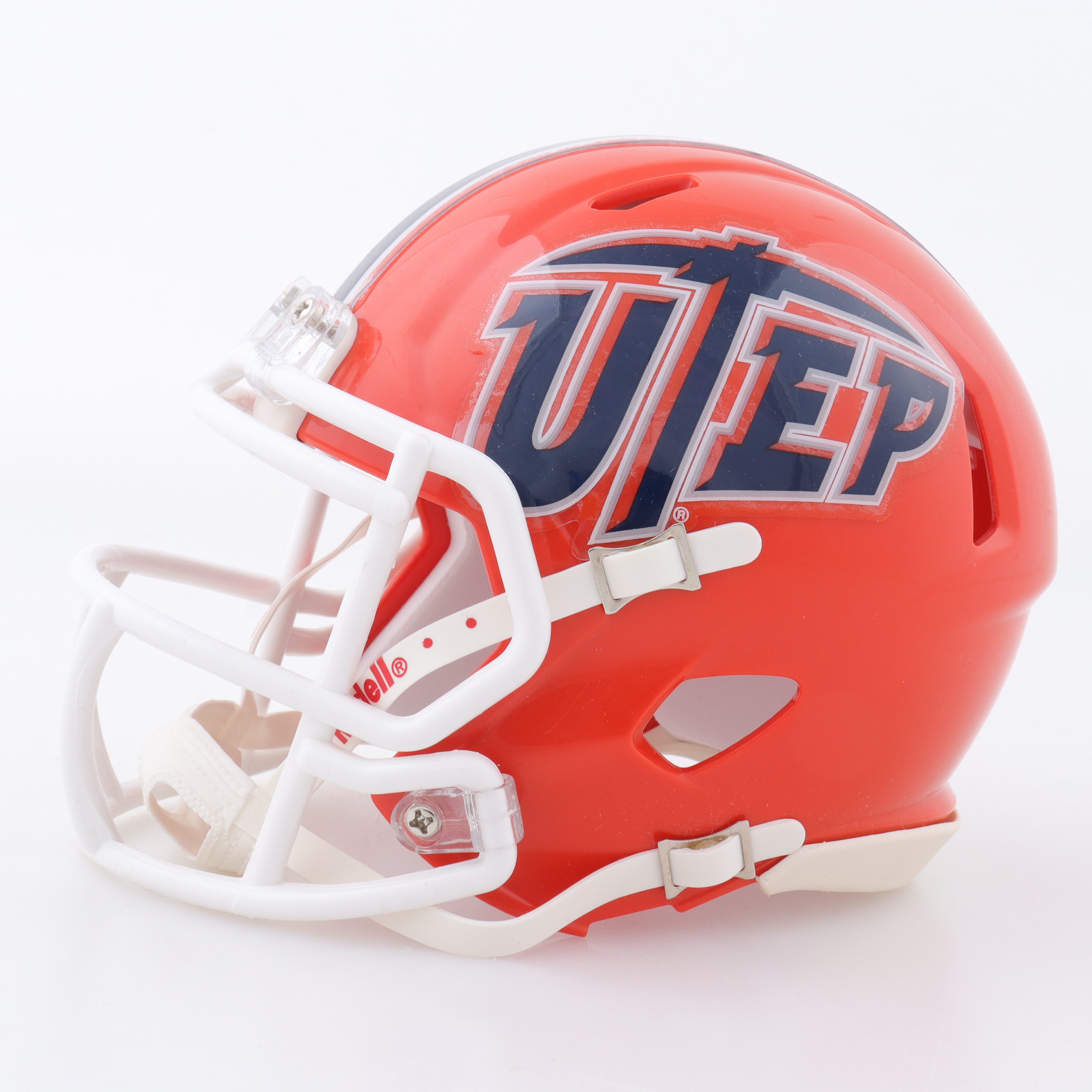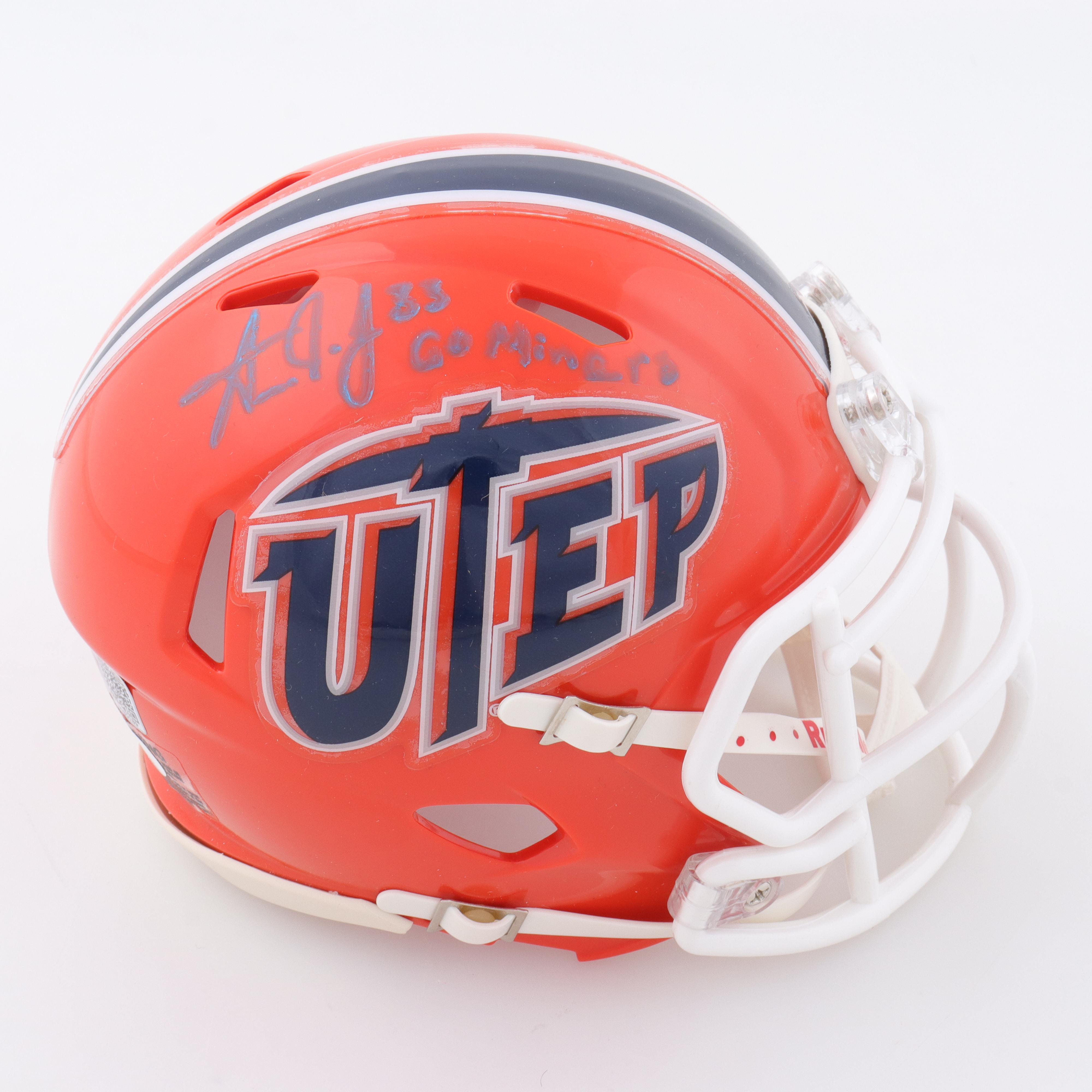 Riddell UTEP Miners Speed mini helmet. Hand-signed and inscribed by Aaron Jones.
