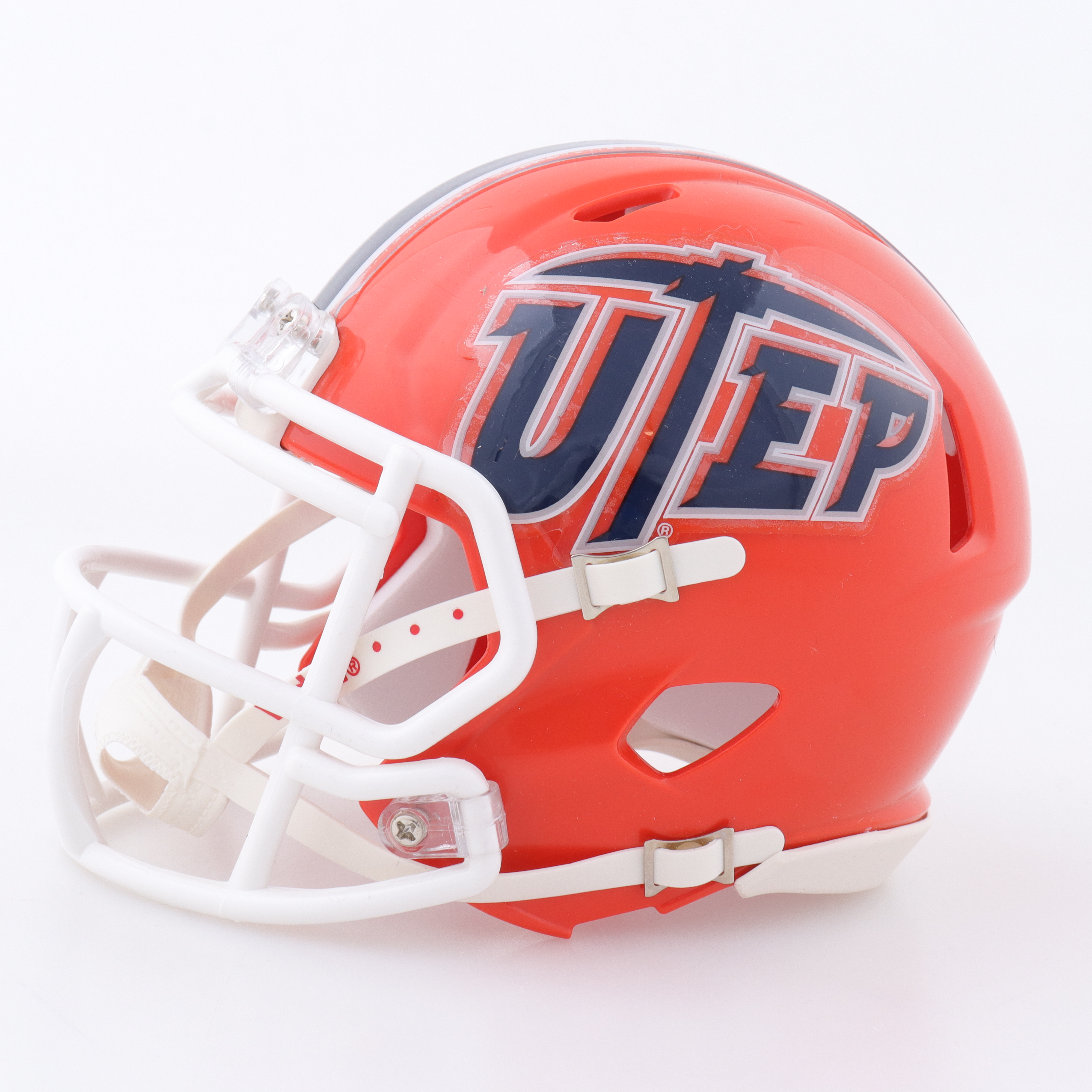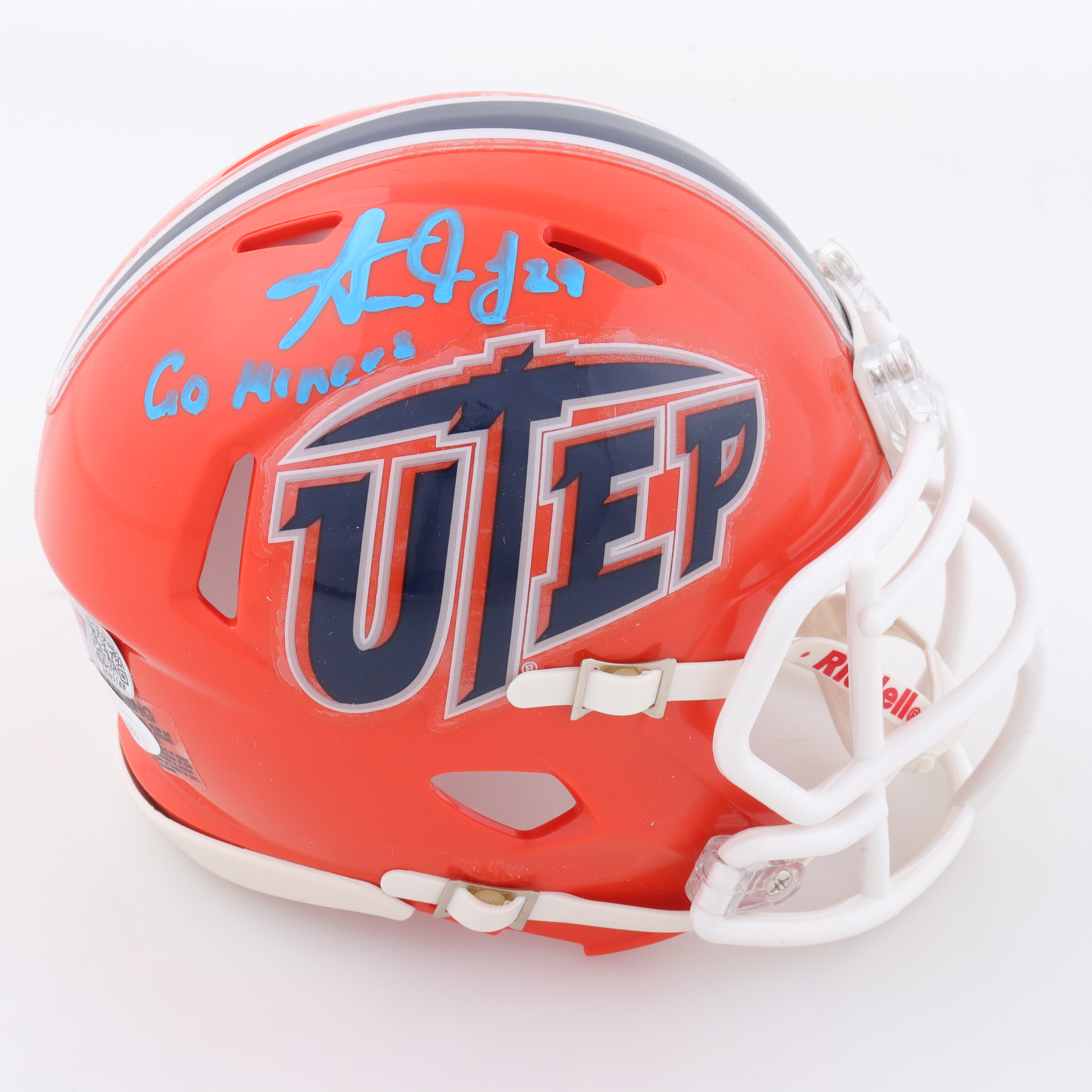 Riddell UTEP Miners Speed mini helmet. Hand-signed and inscribed by Aaron Jones.