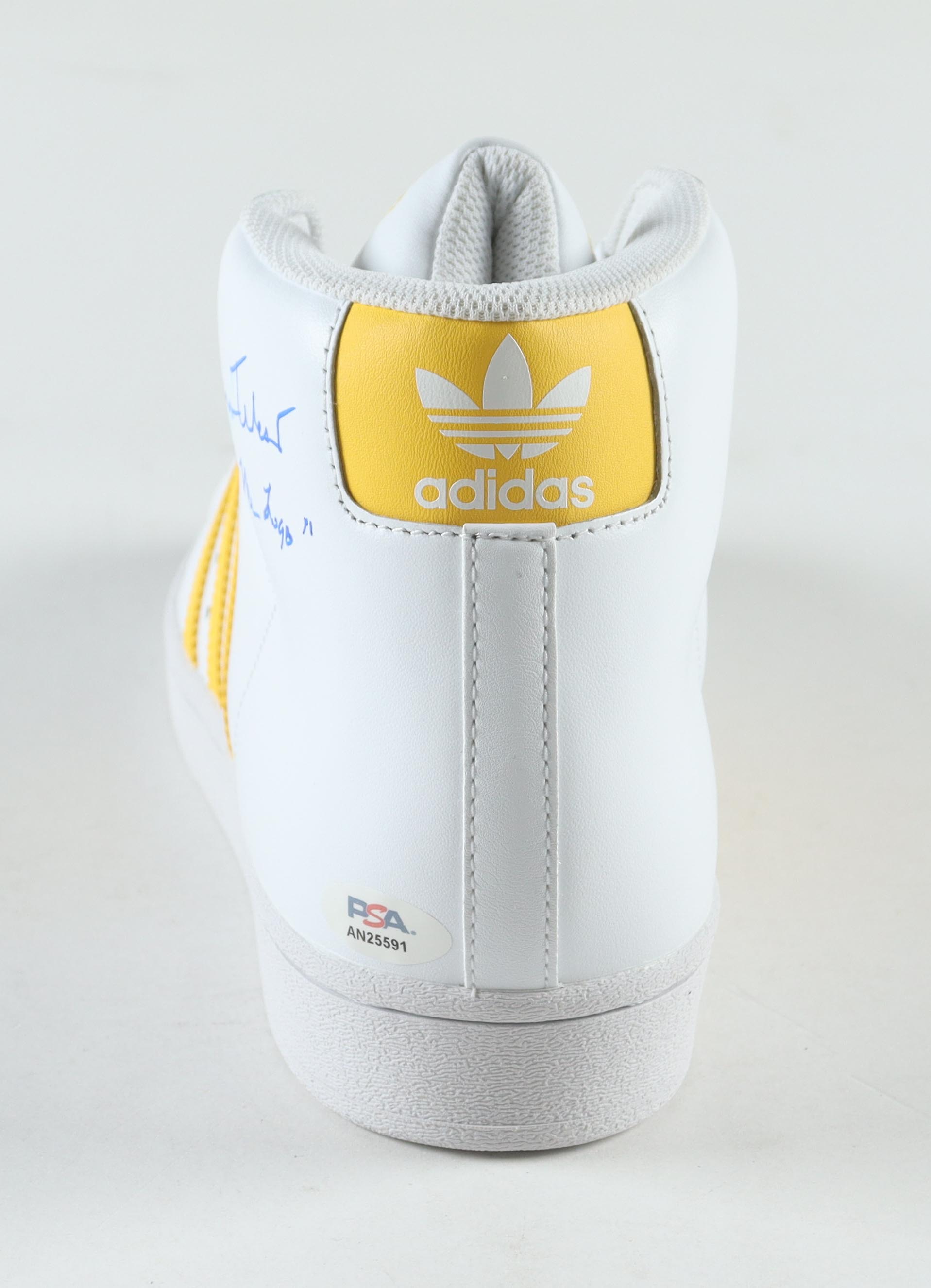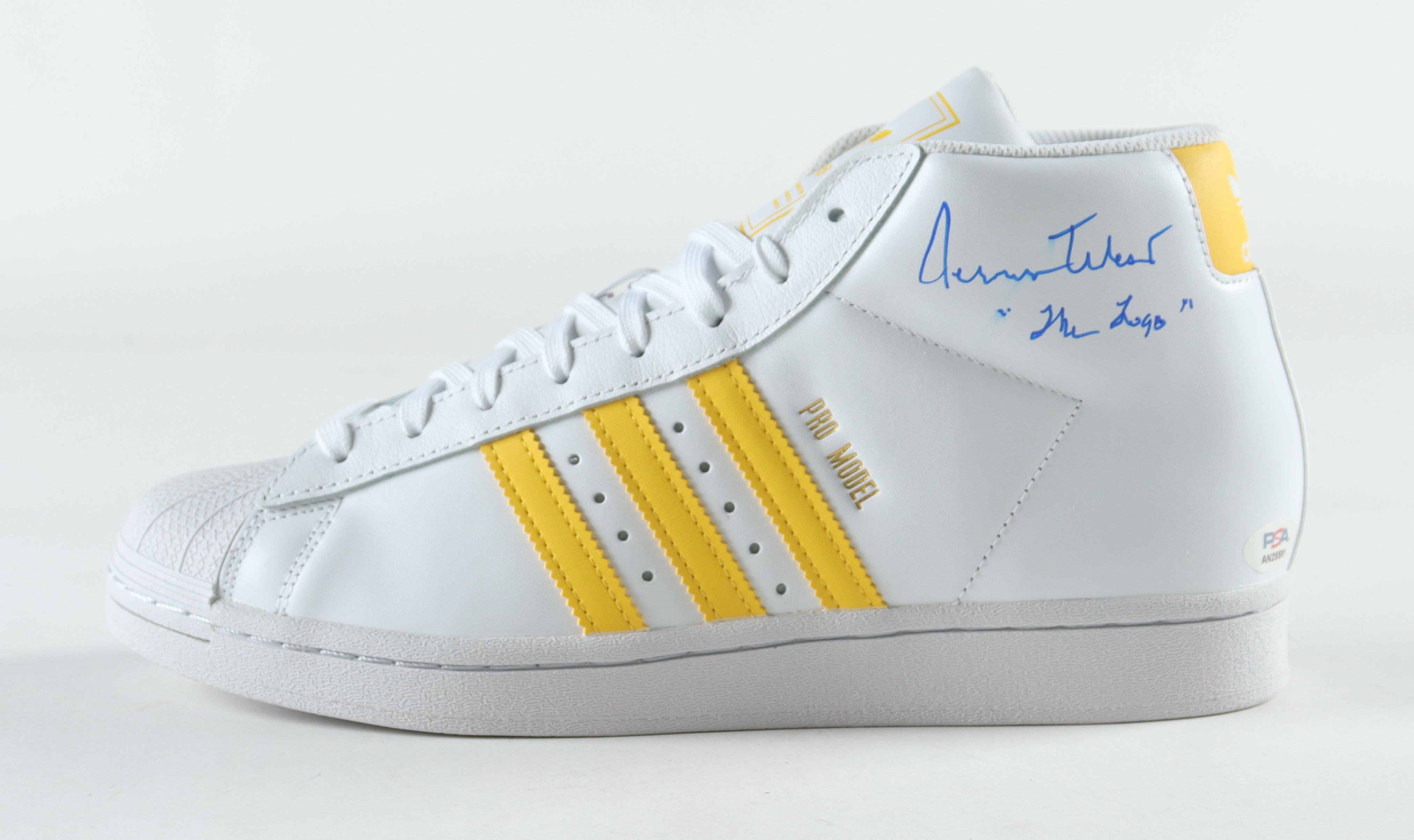 Jerry West Signed Yellow Adidas Pro Model Basketball Shoe Inscribed "The Logo" (PSA)