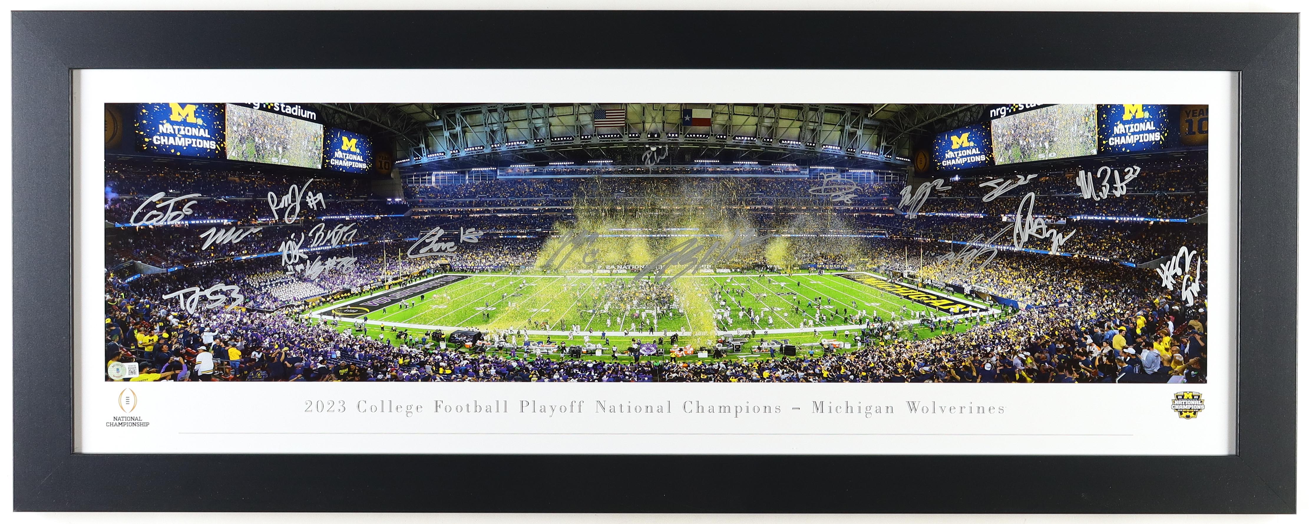 Custom frame measures 17" x 44" in size and features a panoramic photo hand-signed by (18) including Blake Corum, Mike Barrett, Junior Colson, J. J. McCarthy, Mason Graham, Kenneth Grant, Benjamin Hall, Jaylen Harrell, Kris Jenkins, Cornelius Johnson, Will Johnson, Trente Jones, Colston Loveland, Braiden McGregor, Rod Moore, Semaj Morgan, Roman Wilson, Zak Zinter.
