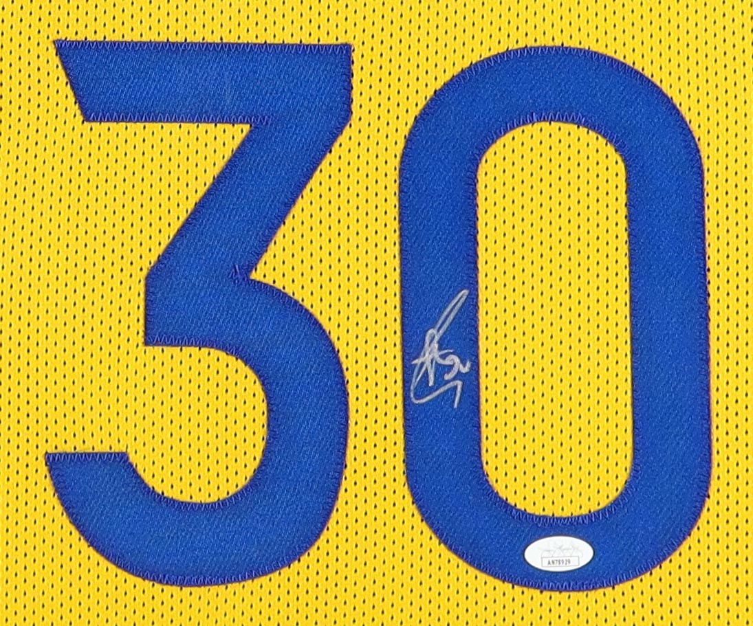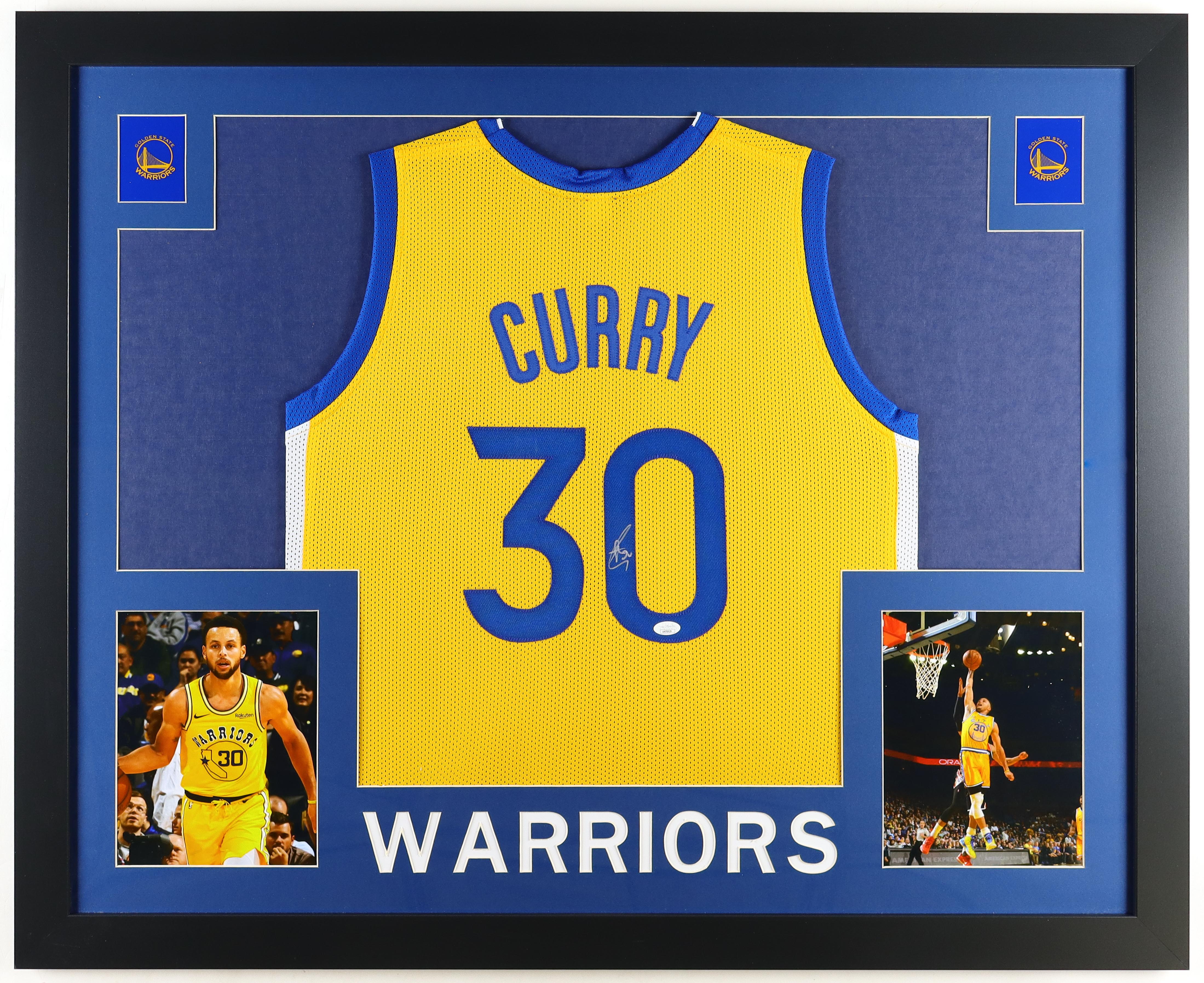 Custom frame measures 36" x 44" in size and features a jersey hand-signed by Stephen Curry. Please note, 8x10 photos may be swapped.