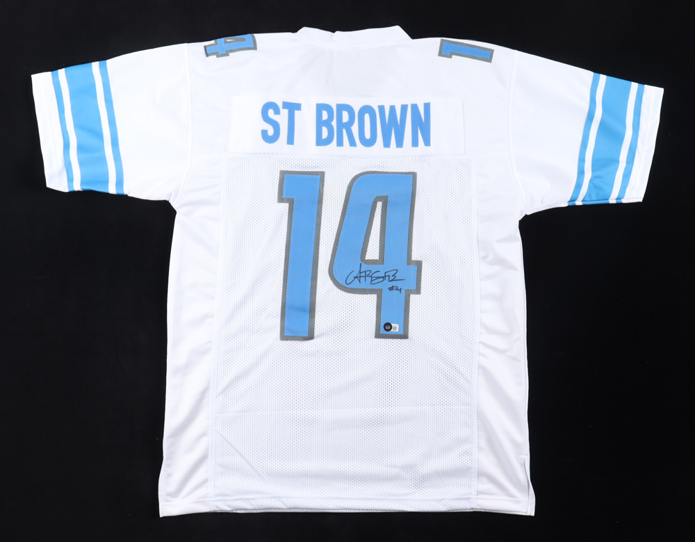 Custom jersey. Everything is sewn on, size XL. Hand-signed by Amon-Ra St. Brown. Please note, there is a stain above the players name.